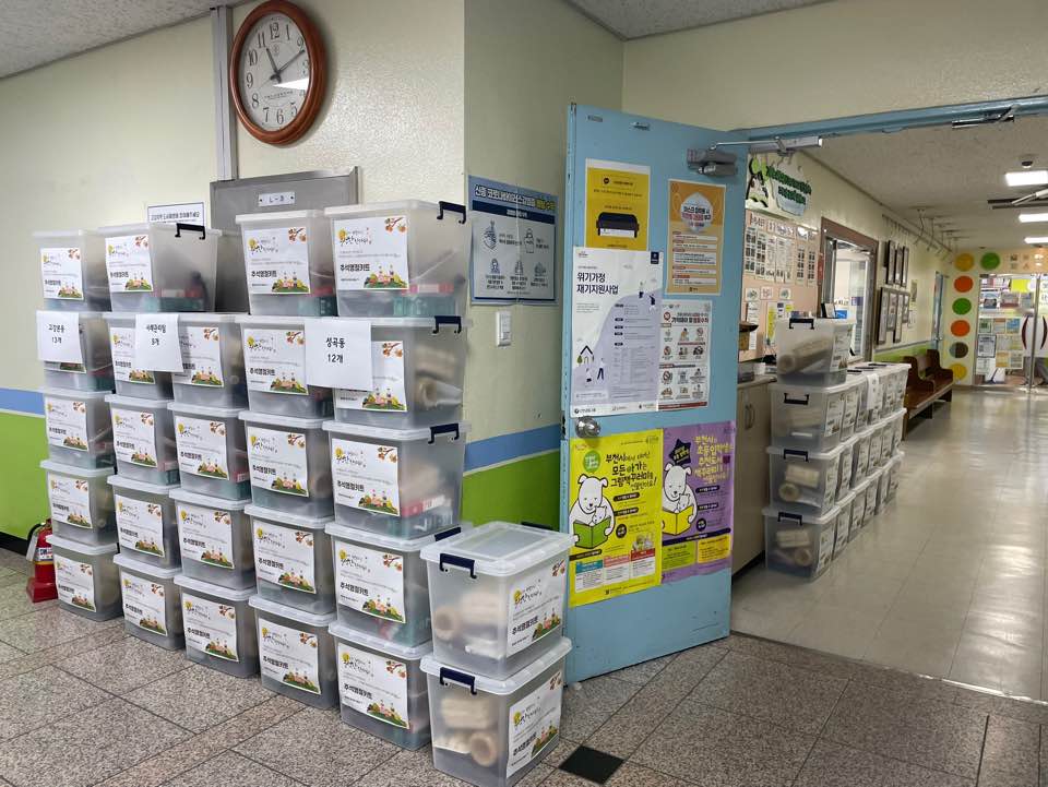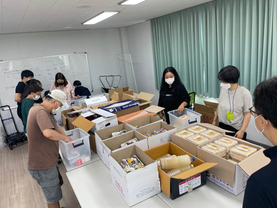 많은 자원봉사자를 부르기보다 마을 주민 몇몇 분께 봉사를 부탁드렸습니다. 흔쾌히 5명의 자원봉사자가 함께해주셨고 현재 복지관에서 사회복지 실습을 하고 있는 실습생 5명, 직원들과 함께 포장을 하였더니 손들이 다들 빠르셔서 1시간 만에 포장이 완성! 아침부터 땀흘리며 수고해주신 자원봉사자 분들과, 이른 아침부터 준비해 배달해주신 상인분들도 진심으로 감사드립니다~!