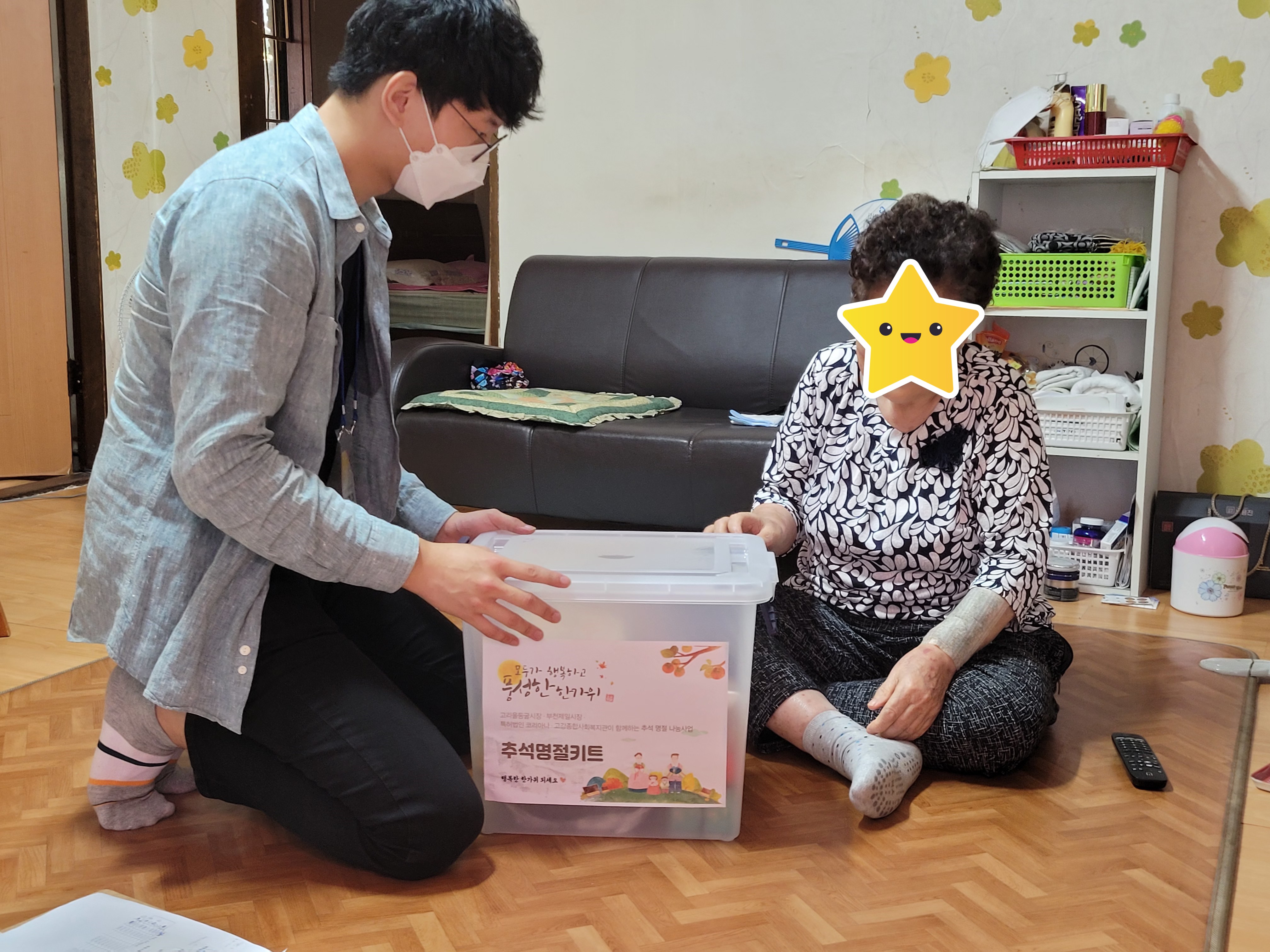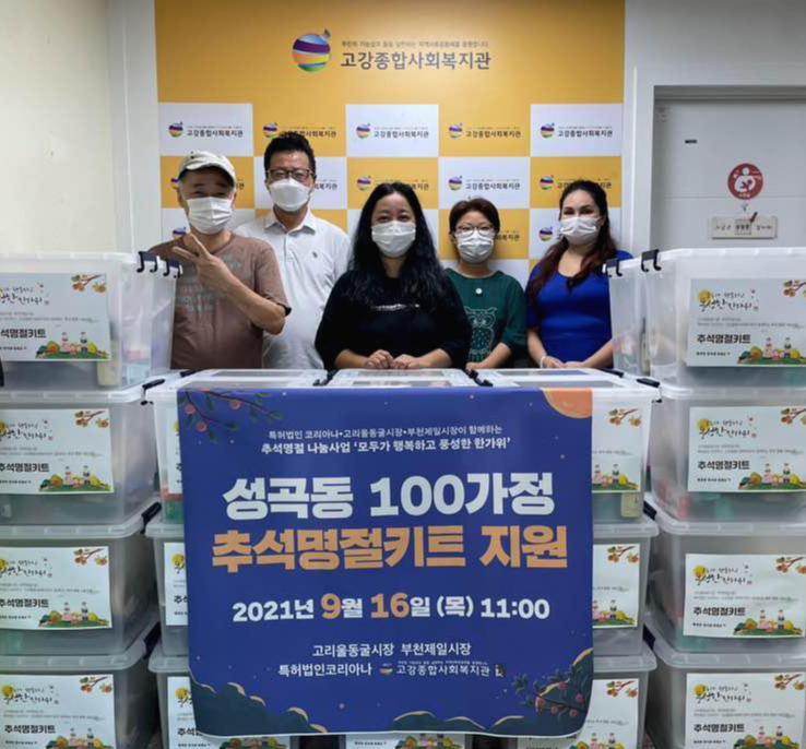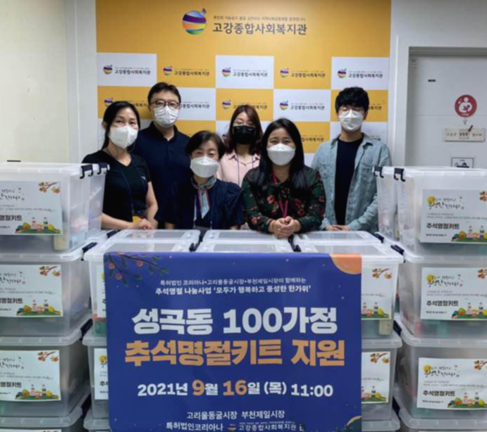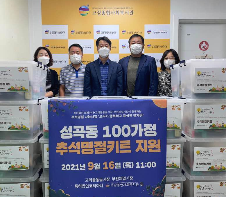 이번 추석 선물은 특별히 지역의 전통시장인 고리울동굴시장과 부천제일시장 상인회에서 함께 후원해주시고, 시장 상점들에서 신선하고 풍성한 물품을 준비해주셨습니다. 시장과 함께 특허법인 코리아나에서도 330만원의 후원금을 더 보태주신 덕분에 더욱 풍성한 추석 선물을 드릴 수 있었습니다. 키트 방식으로 묶음하여 마련된 이번 추석 명절 선물은 복지관에서 주가 되기보다 마을 시장 상인회, 후원단체 등에서 나눔으로 함께 하도록 제안함으로써 참여의 나눔, 상생의 공동체를 만드는 과정으로 진행하였습니다.