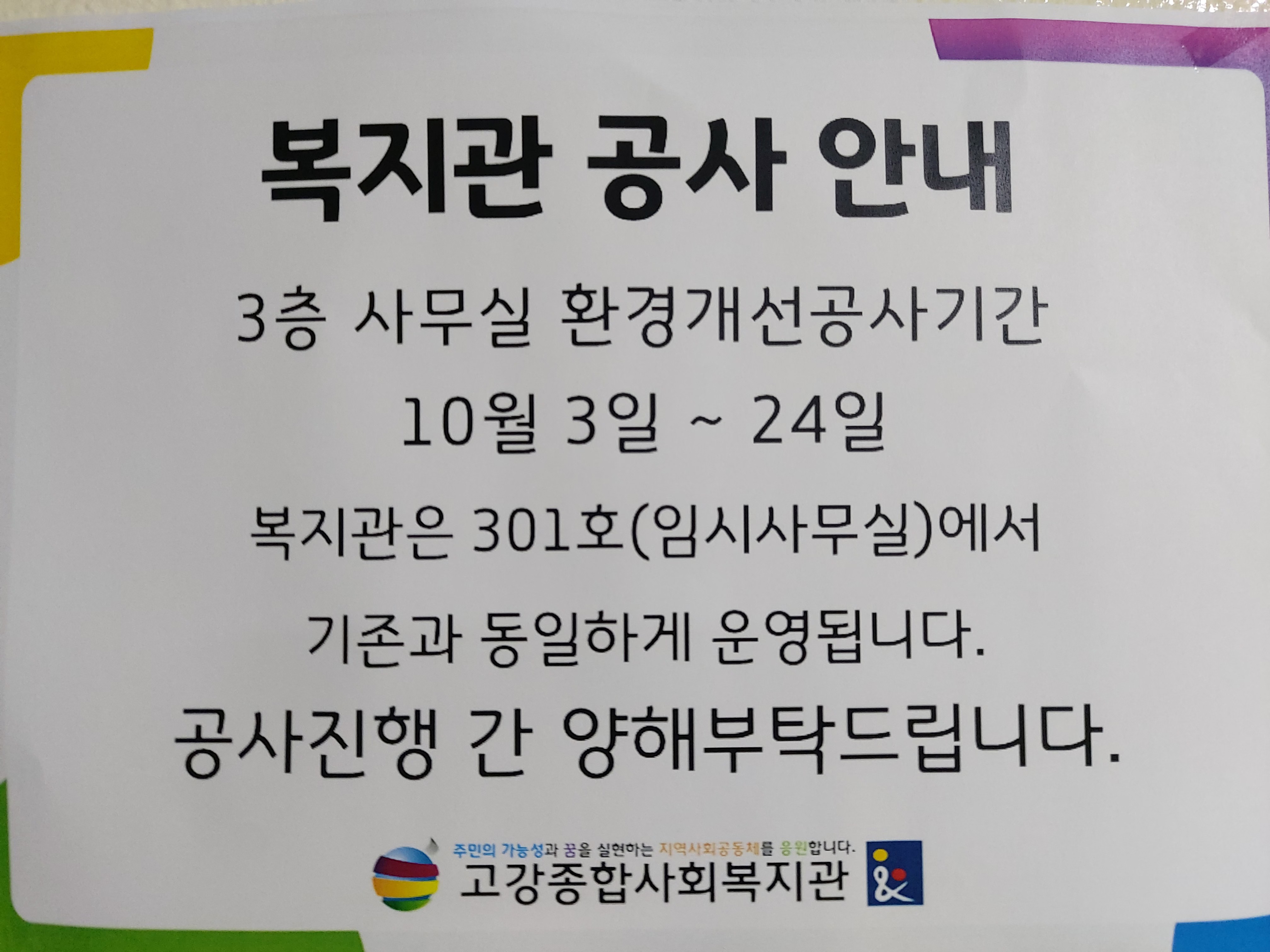 공사기간 동안 사무공간은 임시로 301호 샘말,