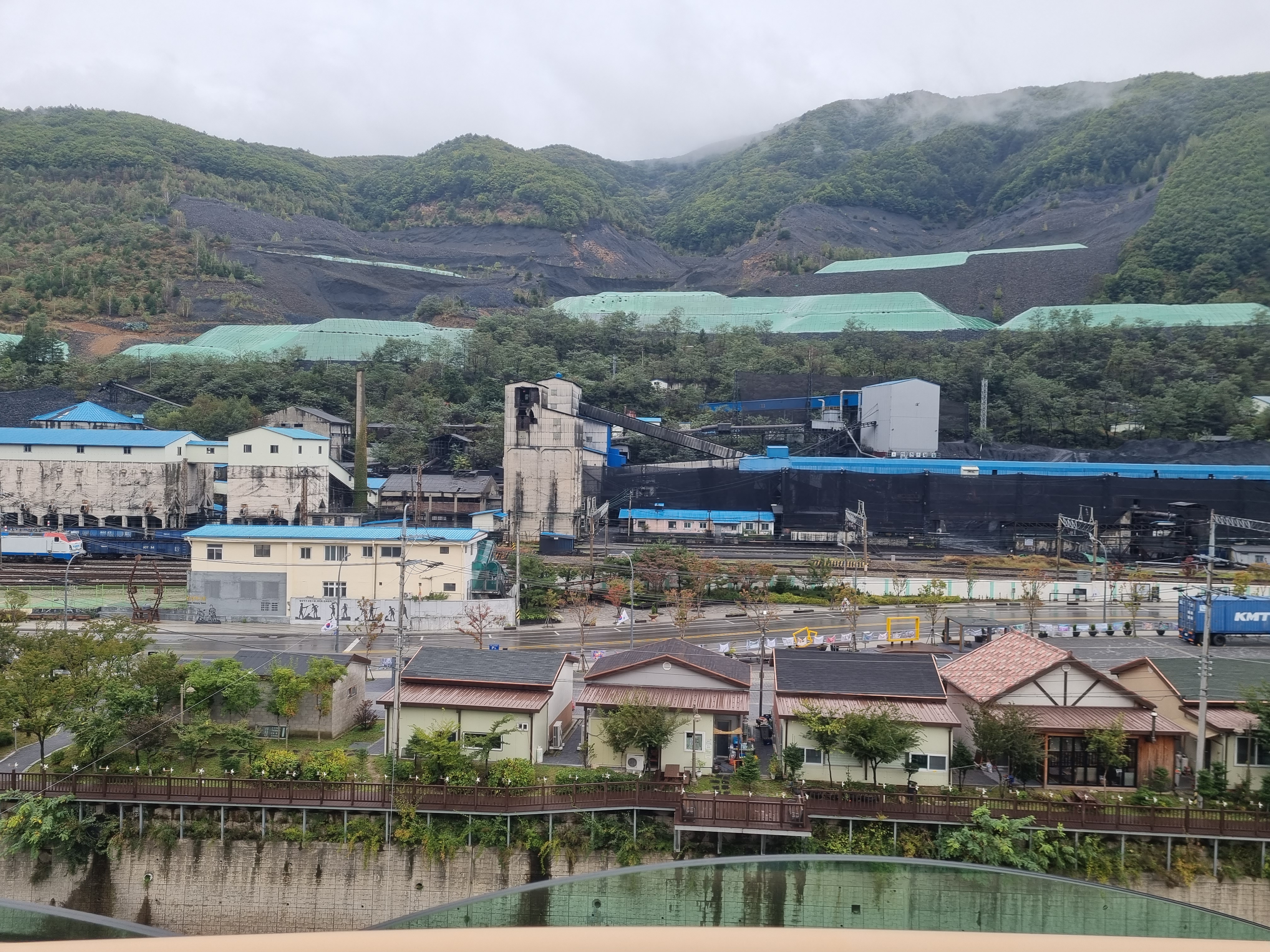 높은 산골짜기를 따라 쌓여있는 석탄 산 밑으로 지금도 운영중인 탄광이 보입니다.