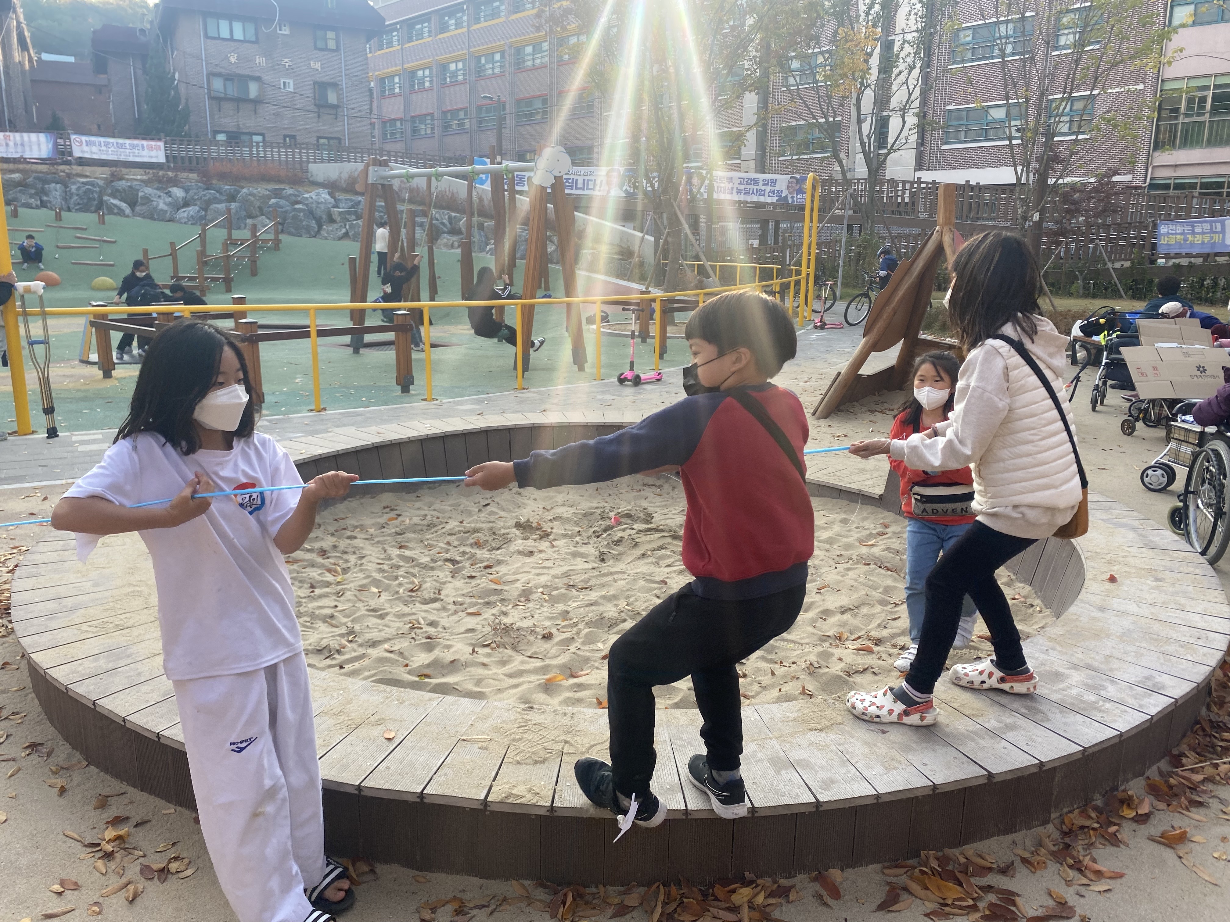 다른 편에서는 노끈으로 아이들이 람보 놀이도 하고 줄다리기도 하며 코부기들을 기다렸습니다.