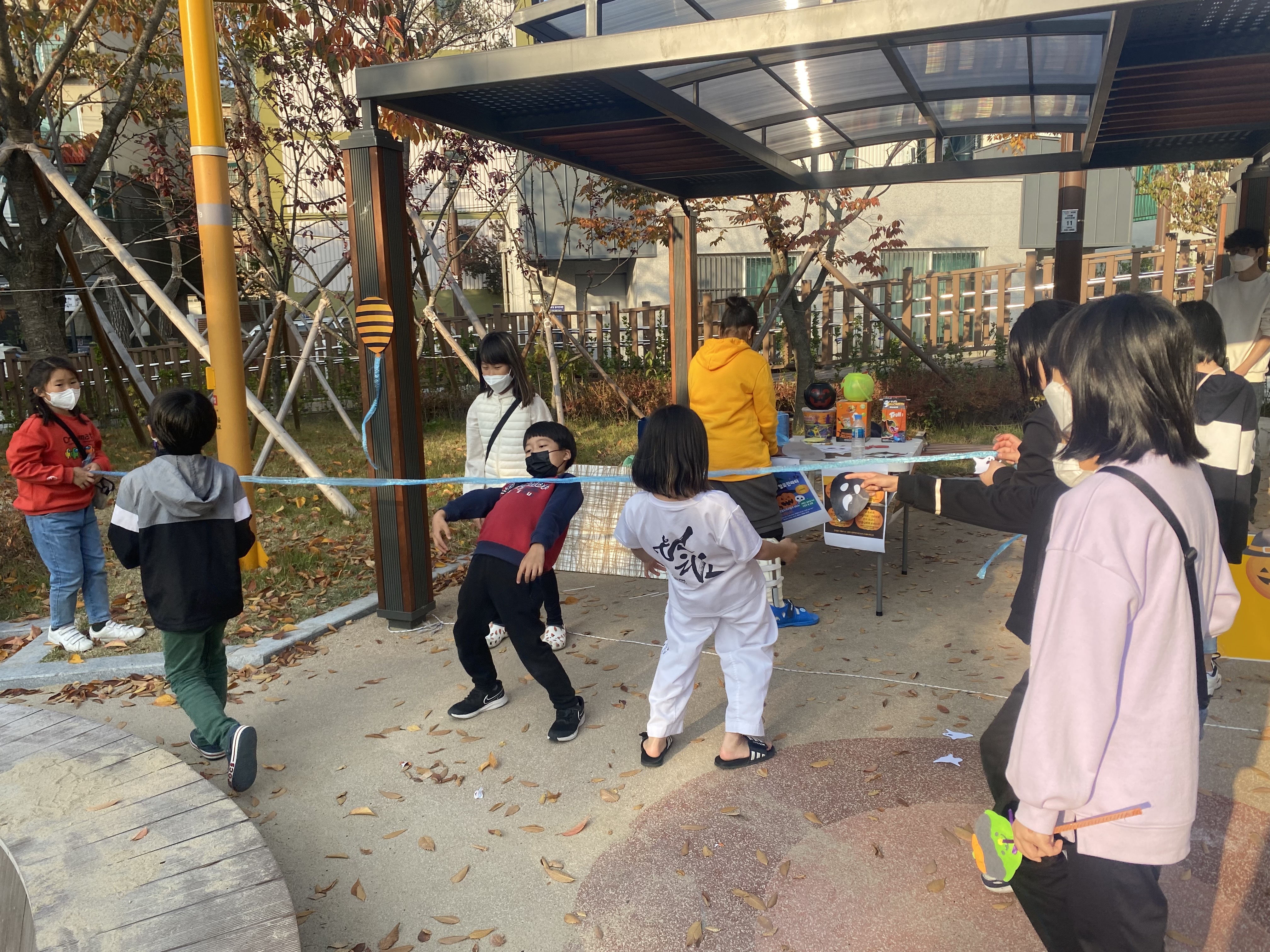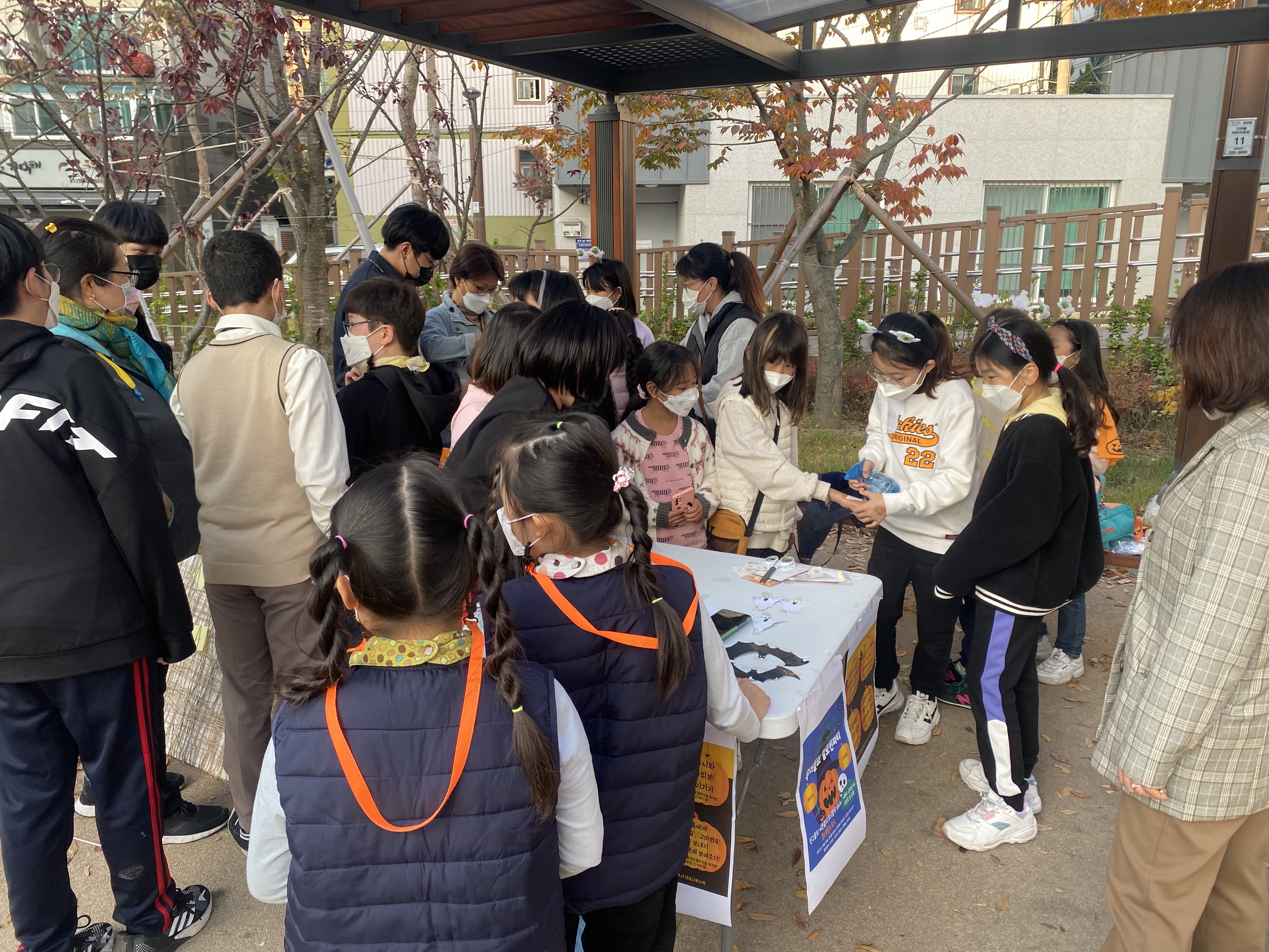 아이들이 열심히 참여하고, 주변에서 보던 어머님들이 간식과 사탕을 나누어주었어요.