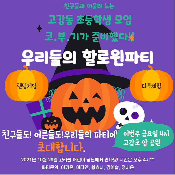 10월 29일, 고강동 초등학생 모임 코.부.기 (이하 코부기) 들이 준비한 할로윈 파티를 진행하기로 한 날입니다.