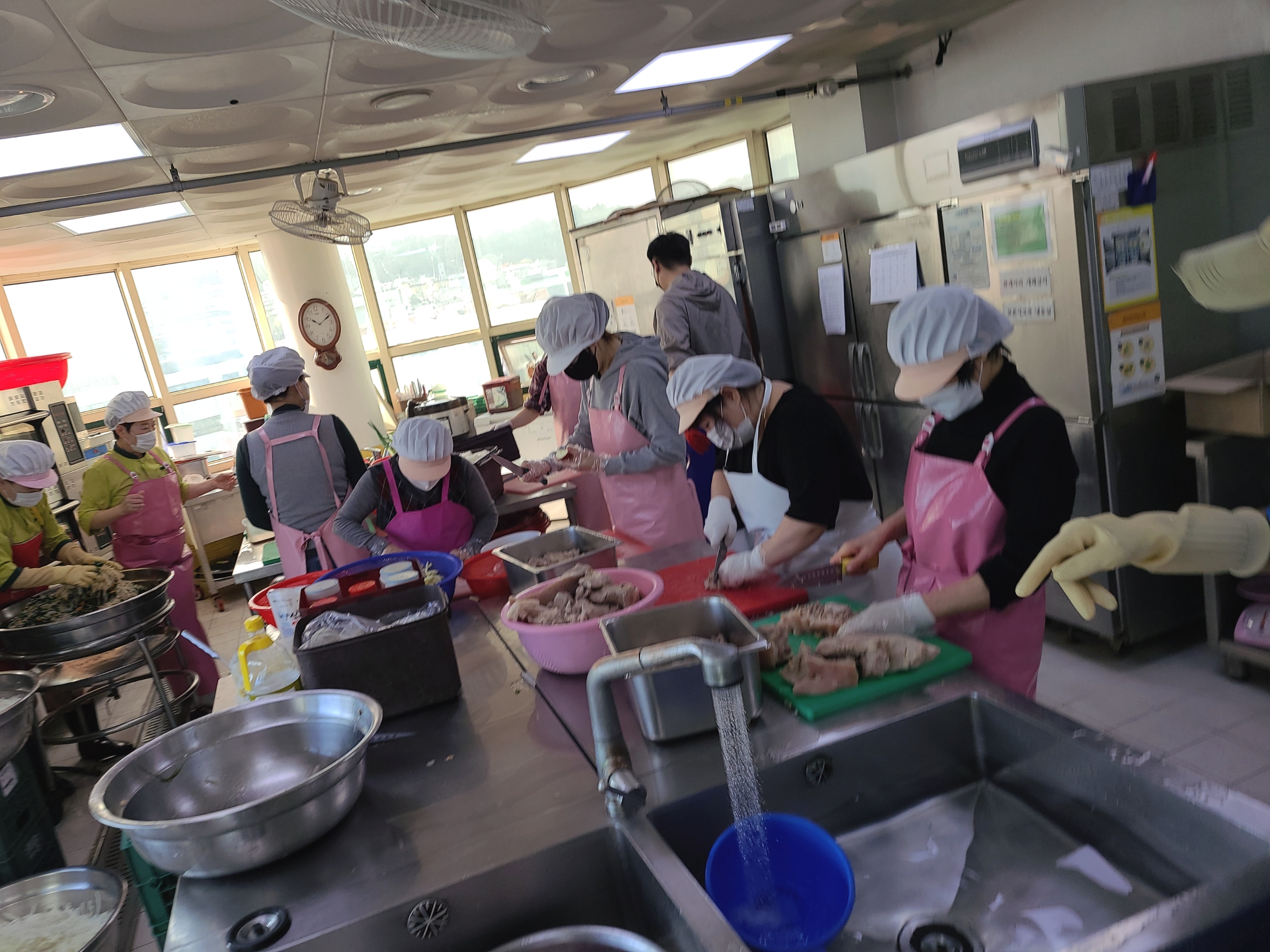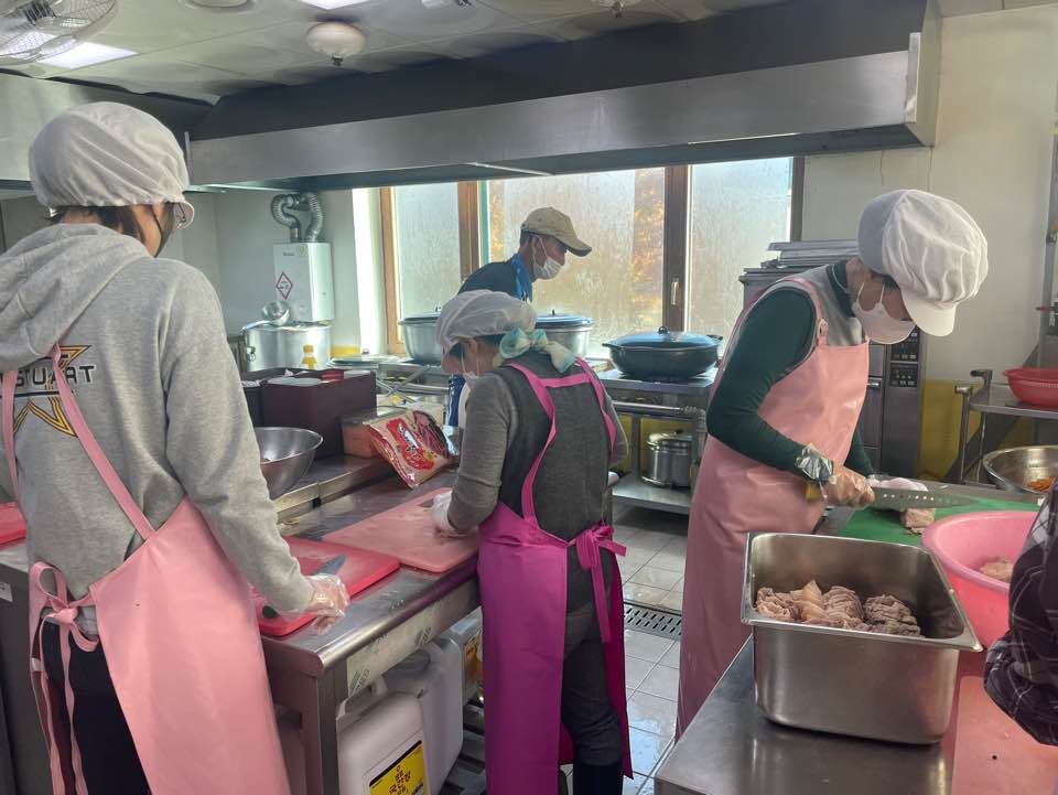 조+이은: 주방 안이 굉장히 정신이 없었고 하는 일도 많았어요. 그리고 쉼없이 역할이 바뀐다는 생각을 했어요. 준비하는 것의 양이 상당하였고, 교육을 받았을 때 영양사님이 전쟁같다고 표현하셨는데 정말 딱 맞는 표현이라는 생각을 했습니다. 홀에서 포장작업을 할 때는 잘 했다고 생각하지만 주방에서 칼질을 할 때는 별로 도움이 되지 않는다는 생각이 들었습니다.