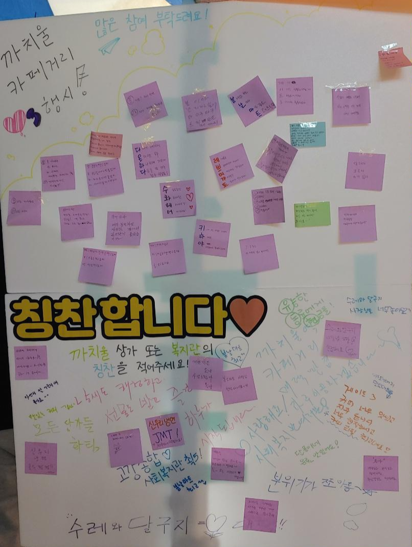 카페거리 상점에 하고 싶은 말도 적어봅니다. 맛도 좋고 분위기 좋고 인심도 좋다는 칭찬 일색입니다.