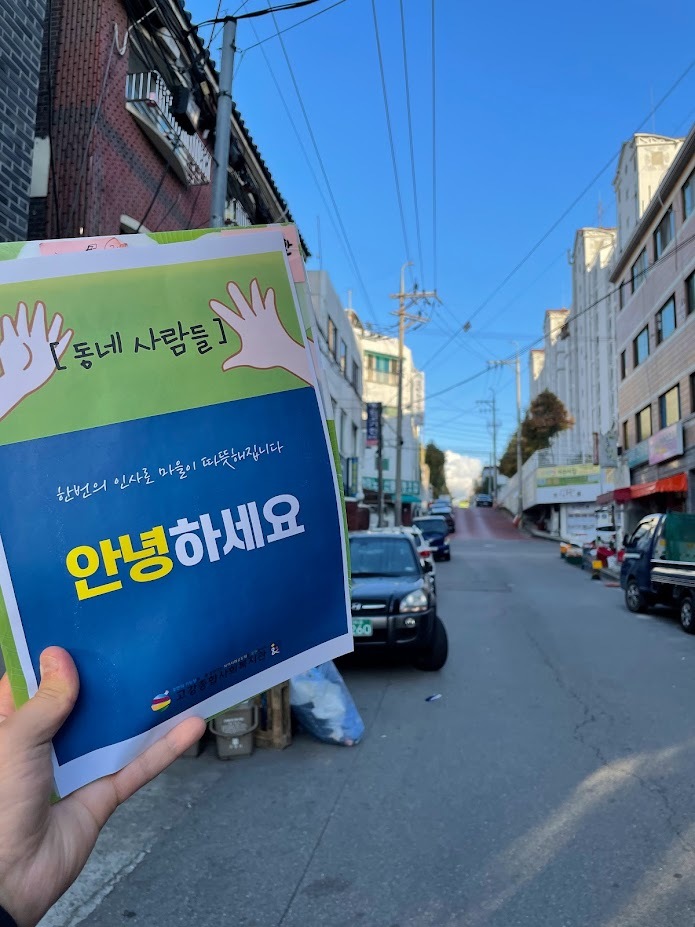 오늘의 활동을 통해 주민께 인사 하는 과정이 꼭 필요하다는 것을 다시 한 번 느끼게 됐습니다. 처음 뵀을 때는 무엇을 부탁하기 어렵지만 인사를 통해 관계를 형성한 뒤에는 보다 편하게 말씀드릴 수 있기 때문입니다. 꾸준히 마을에 나가 인사 드리며 관계를 쌓아야 하는 이유를 또 한 번 느낀 하루였습니다.