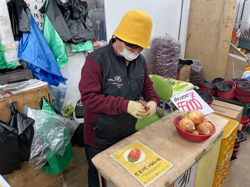 예전에 인사 드렸던 야채 가게에 들러 김장에 필요한 채소들을 판매 하고 있는 사장님께 다가가 인사 드렸습니다. 단번에 기억하지는 못하셨지만 제가 들고 있는 홍보지를 보시니 “더울 때 와서 인사하고 가셨죠?”라며 알아봐 주셨습니다.