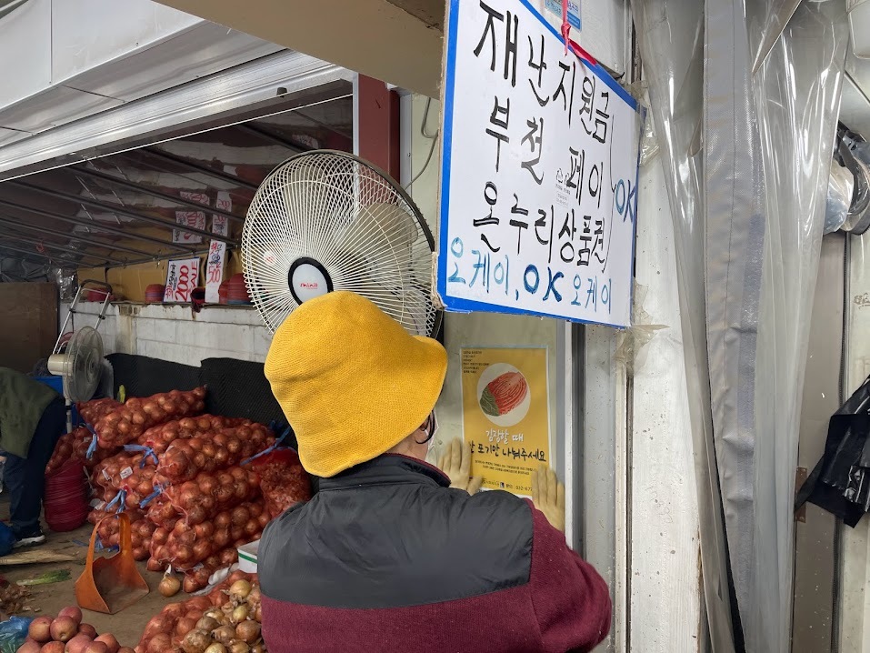 사장님은 “요즘에는 김장하는 사람이 많이 없다 보니까 젓갈을 사는 사람이 적어서 효과가 있을지는 모르겠네요. 그래도 잘 보이는 곳에 한 번 붙여보세요~!”라고 하시며 부착을 허락해주셨습니다. 감사 인사 드린 뒤 상인회 회장님이 운영하시는 카페로 향합니다.