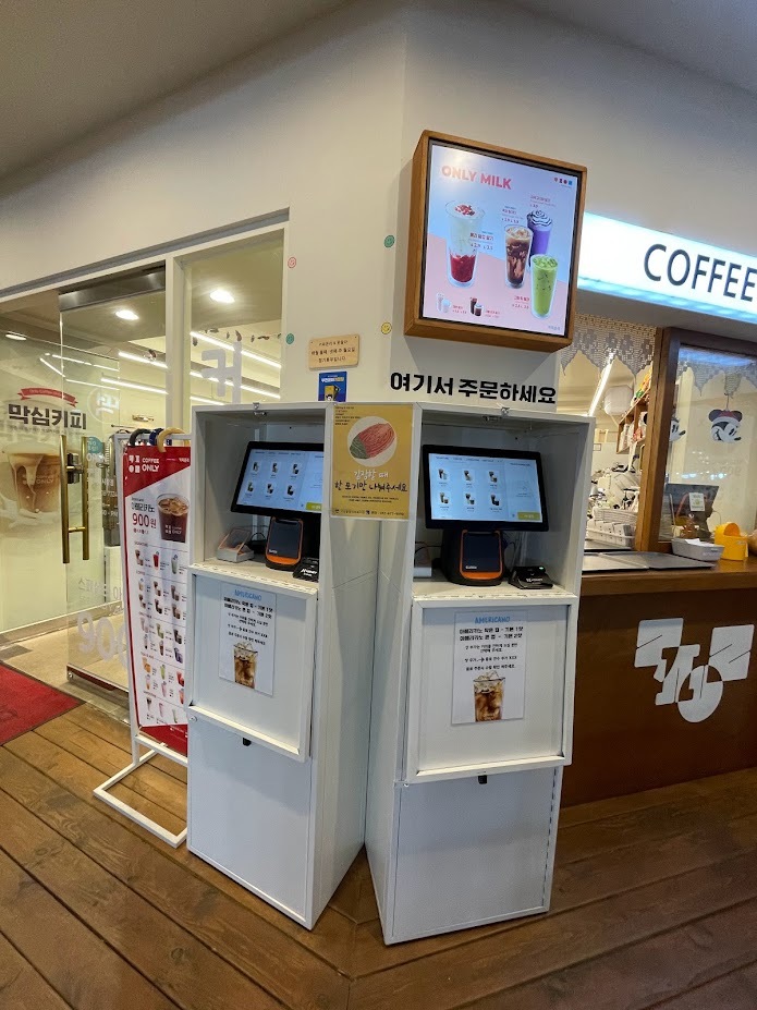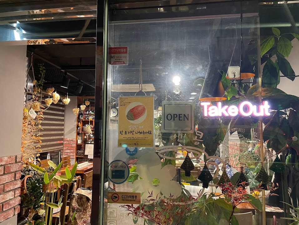 사모님과 만나 인사 나누고 김장 캠페인을 안내합니다. 사모님은 “복지사님들과 자주 뵙다 보니 정말 다양한 일을 하고 계신 걸 알 수 있어 좋다”라고 하신 뒤 카페 이곳 저곳을 보시며 어디에 붙이면 좋을지 고민하셨습니다. 주문을 하기 위한 키오스크 사이에 한 곳, 커피를 받는 수령대에 한 곳 붙이면 카페를 찾는 분들이 잘 볼수 있겠다 하셔서 두 곳에 부착 합니다. 많은 주민이 이용하는 곳이니 높은 홍보 효과를 기대하며 다른 가게로 인사를 드리러 갔습니다.