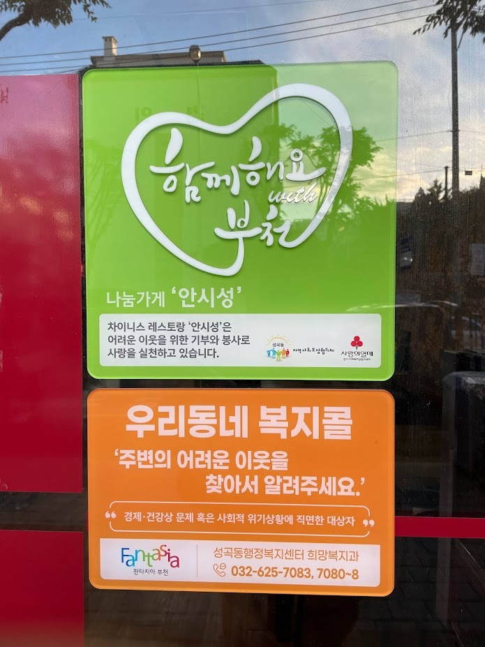 학원에 인사를 마치고 잠시 걷다 보니 ‘나눔 가게’ 명판이 적힌 식당이 눈에 들어습니다. 자세히 보니 공동모금회 로고와 성곡동 지역사회보장협의체와 연계된 곳임을 알 수 있었습니다. 나눔 활동을 하고 계신 사장님께 복지관을 알리기 위해 인사 드렸습니다.