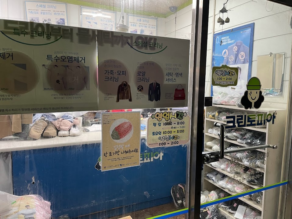 시장을 벗어나 안녕하세요 포스터를 가게에 몇 장 두고 가라고 하셨던 세탁 전문점에 방문했습니다. 이번에도 역시 흔쾌히 포스터 부착을 허락해 주셨습니다. 가게를 방문하는 주민이 많은 만큼 다양한 분들이 관심을 가져주시길 바라며 잘 보이는 곳에 포스터를 부착했습니다.
