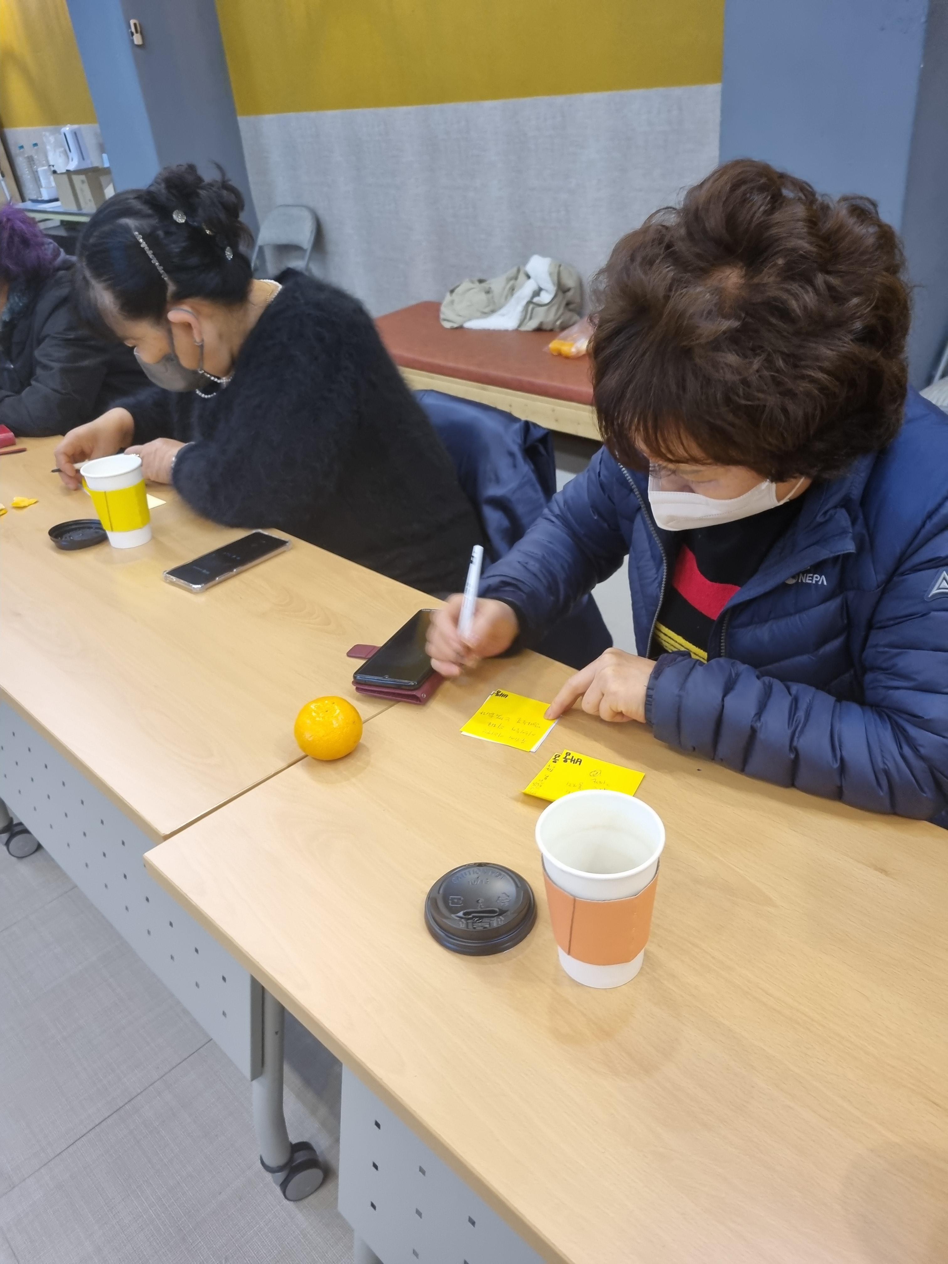함께 지난 1년을 돌아본 뒤에는 밑반찬 배달 봉사를 통해 알게 된 정보나 느낀 감정을 배움, 소망, 감사를 주제로 쪽지를 작성한 뒤 자유롭게 대화 나누는 시간을 가졌습니다.