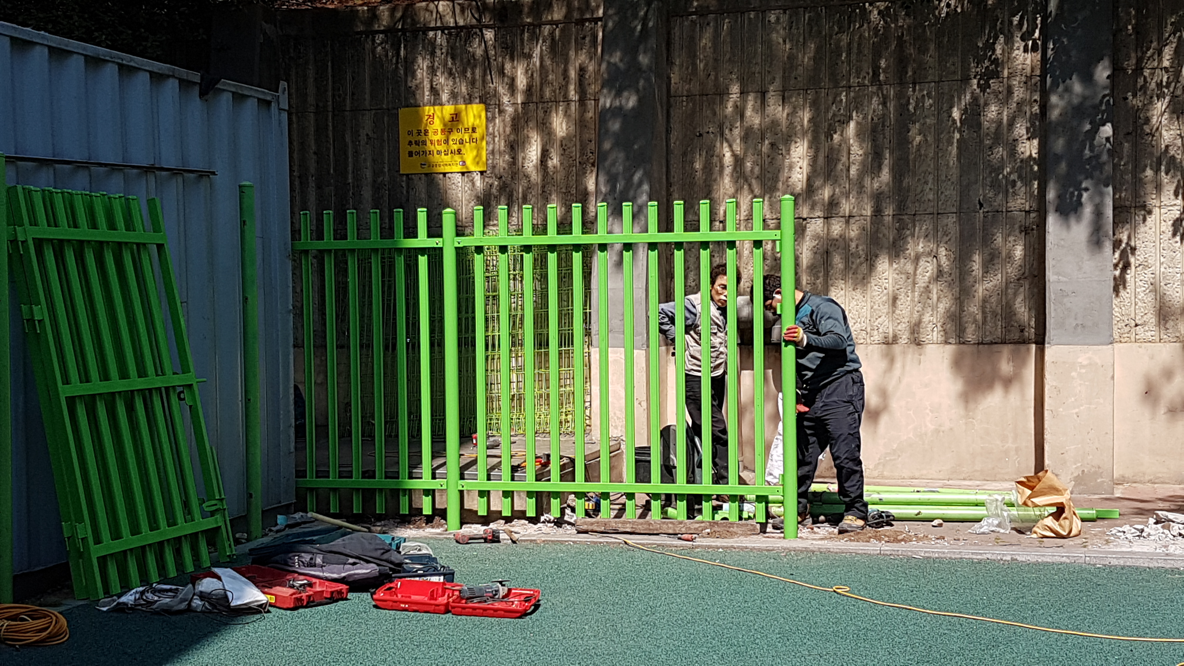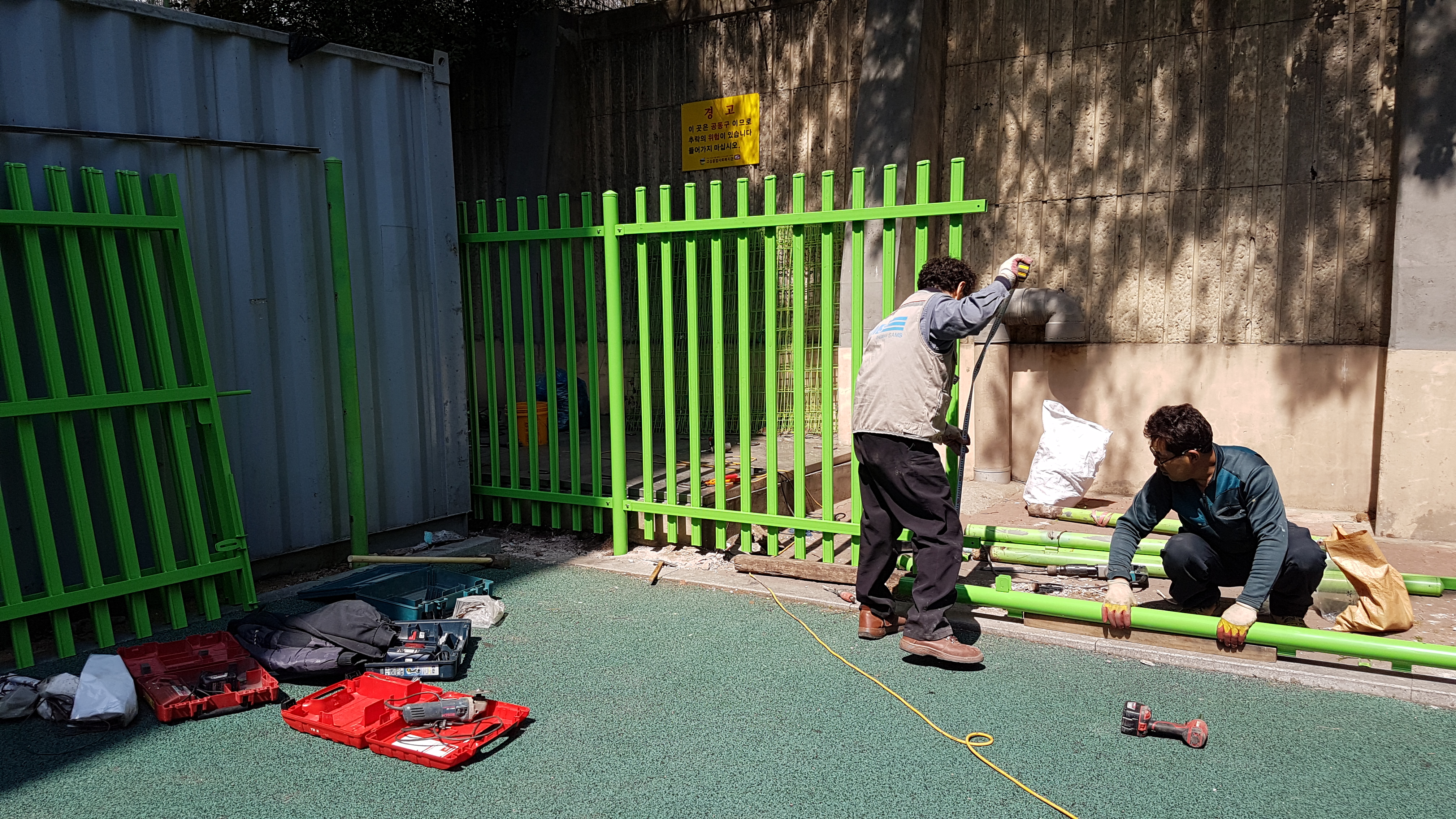 늘 휘어지고 또 뜯어지고, 다시 설치하기를 반복... 완전 봉쇄형으로 가림막을 하면 삭막하기도 하고 그렇다고 마냥 그대로 두기에는 불안해 하시거나 보기에도 불편하여 의견들이 많았습니다.