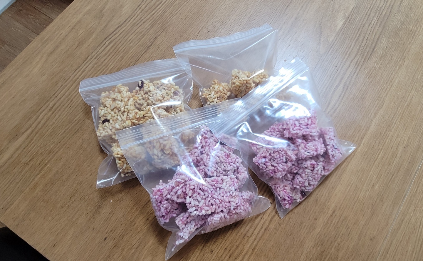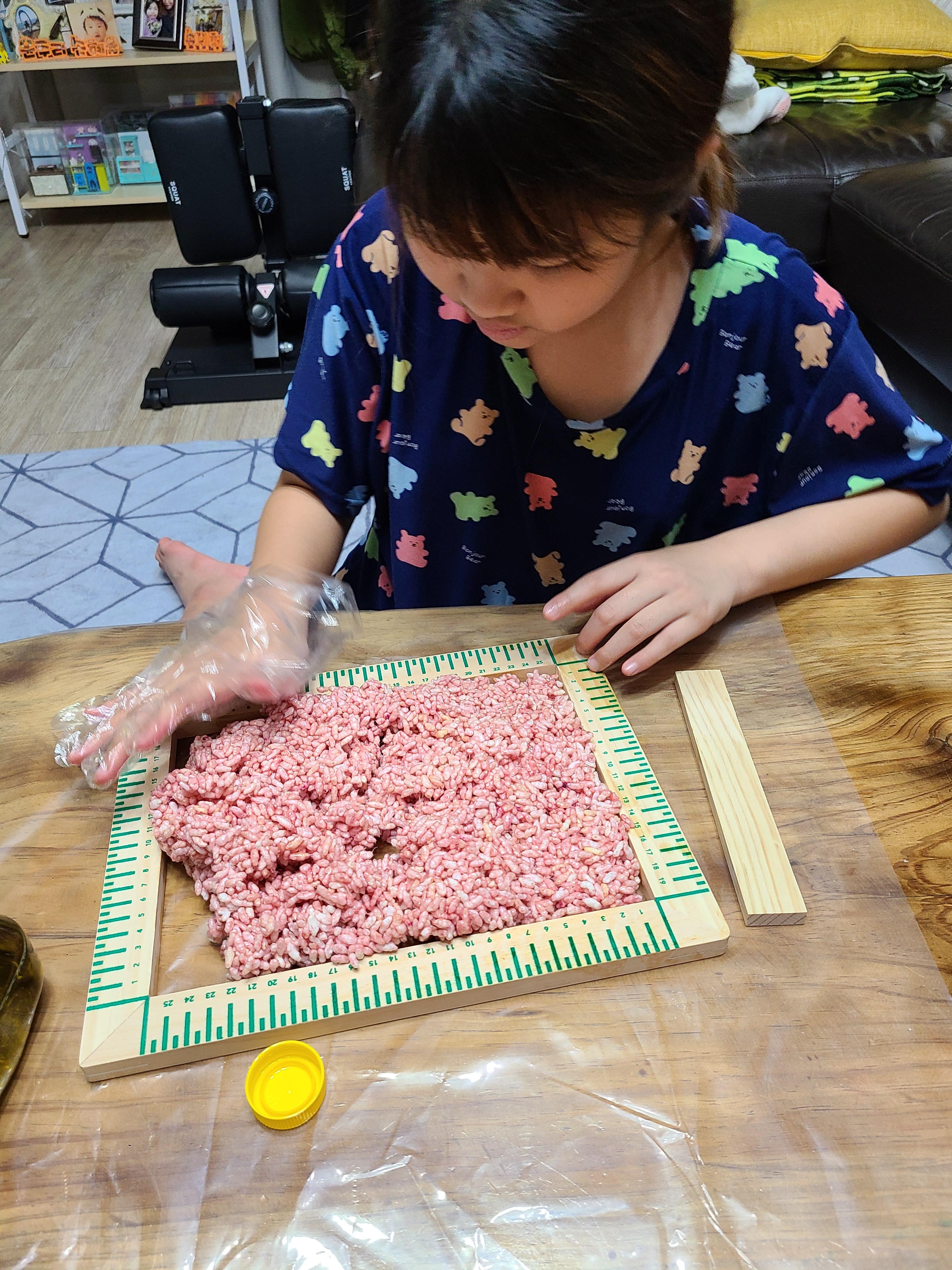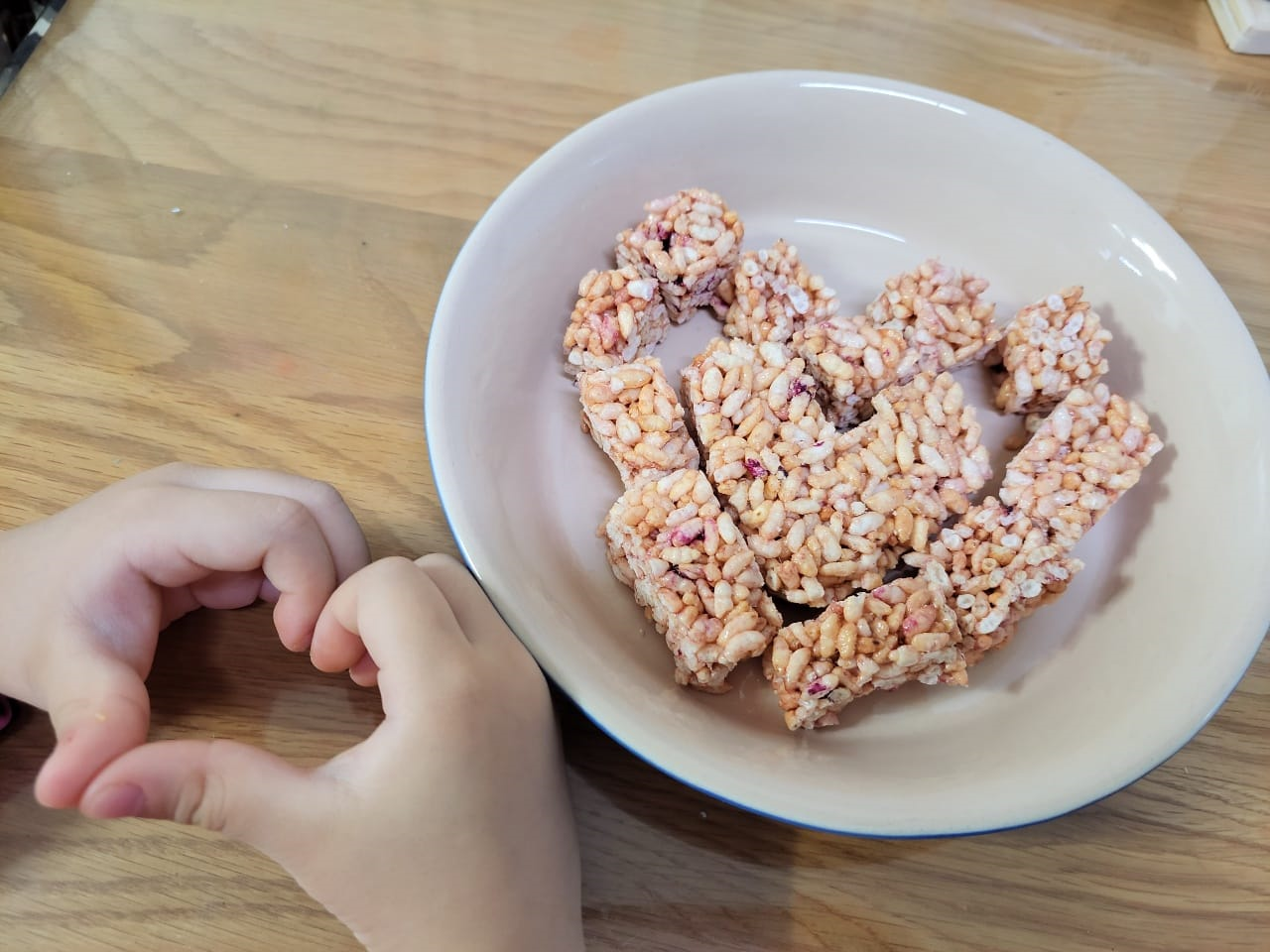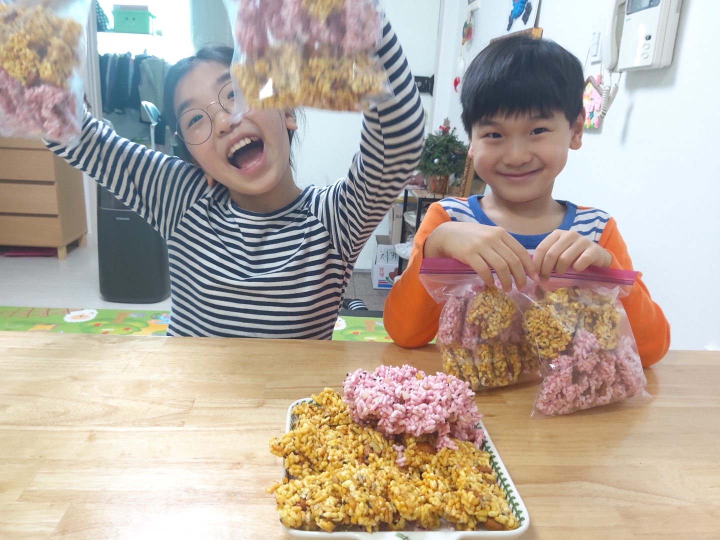 “아이가 강정을 꾹꾹 누르는게 힘들었지만 그래도 모양이 만들어지는게 신기하고 잘못 만들어서 실패를 많이 해서 아쉽지만 즐겁게 재미있는 시간이였습니다.“