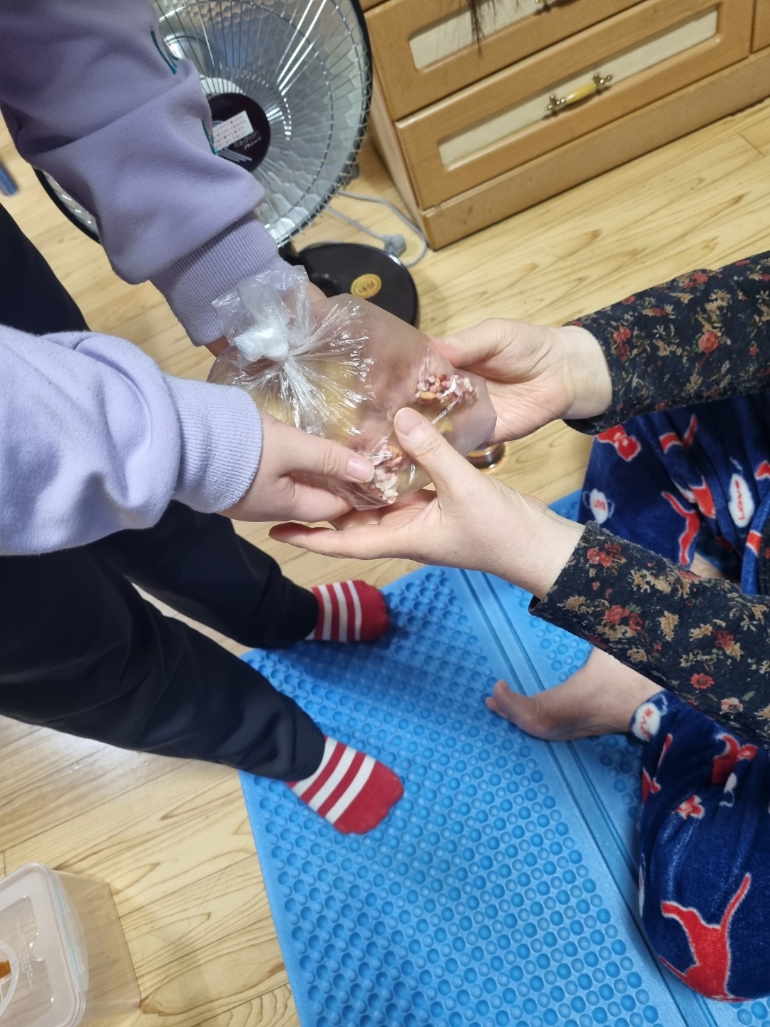 할머니들한테 한과를 드렸는데 맛있게 드셨으면 좋겠어요.“