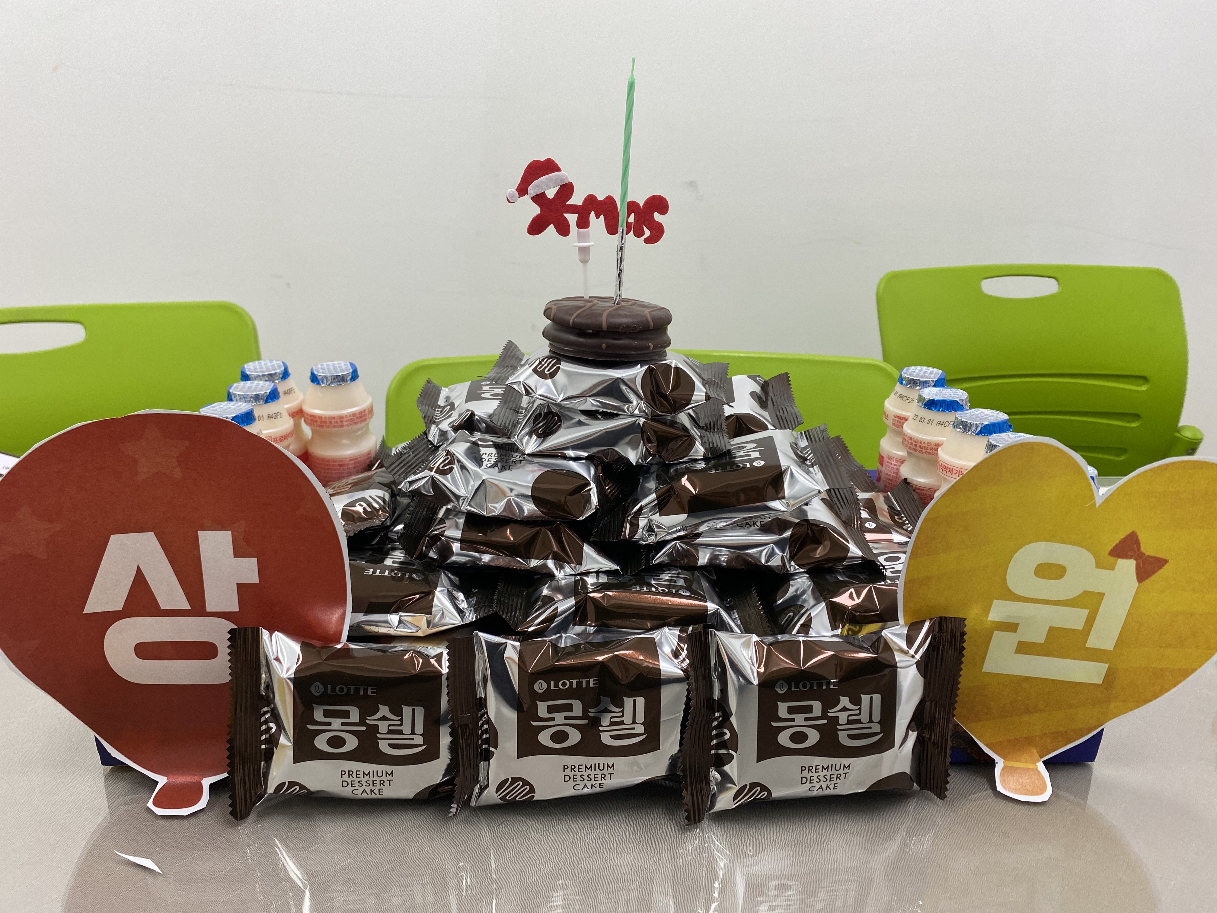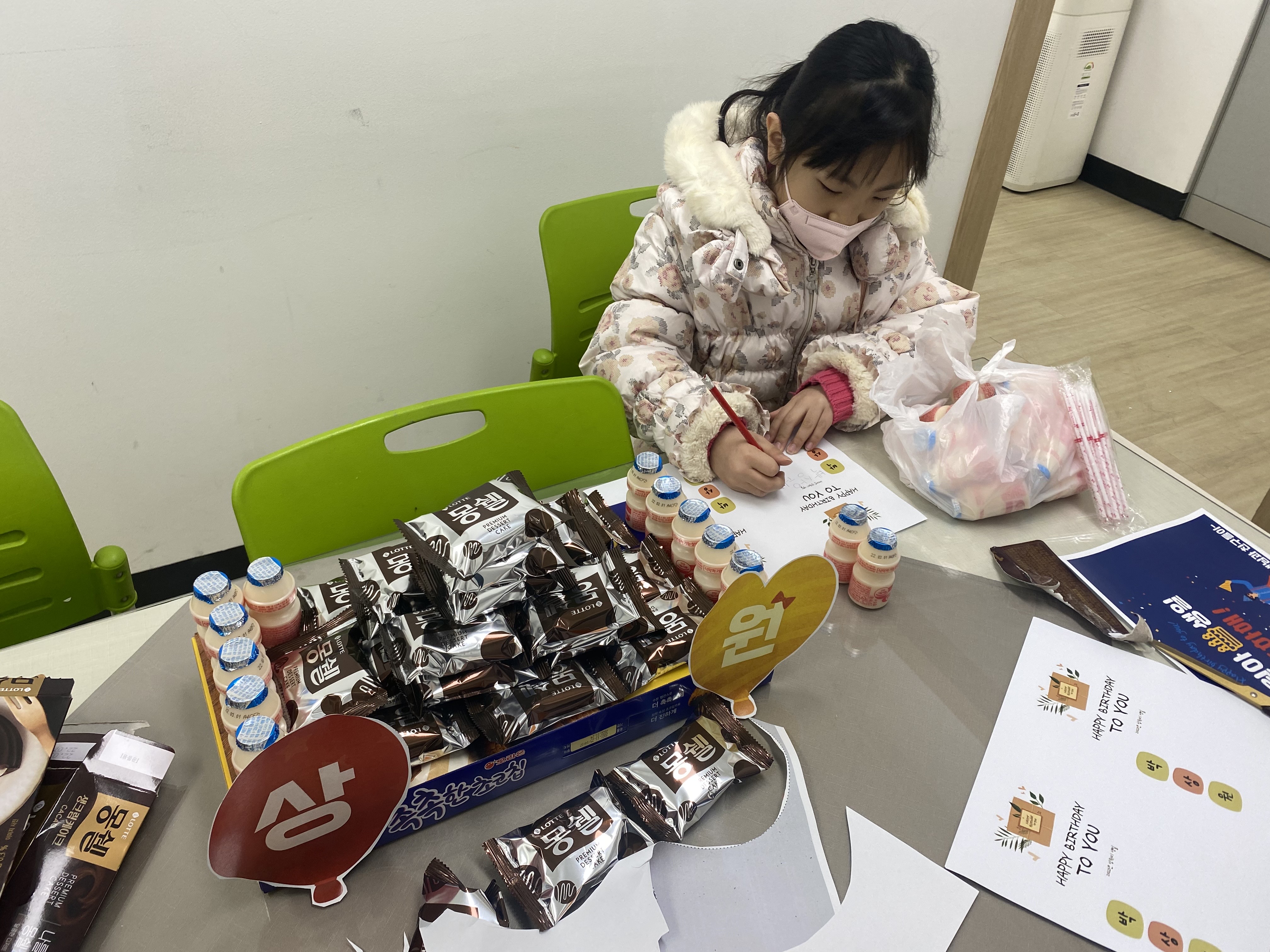 마을 생일파티에서는 소소하게 초코파이, 몽쉘 등 아이들과 나누어 먹을 수 있게 포장되어 있는 과자류로 생일파티 진행하고 있습니다.