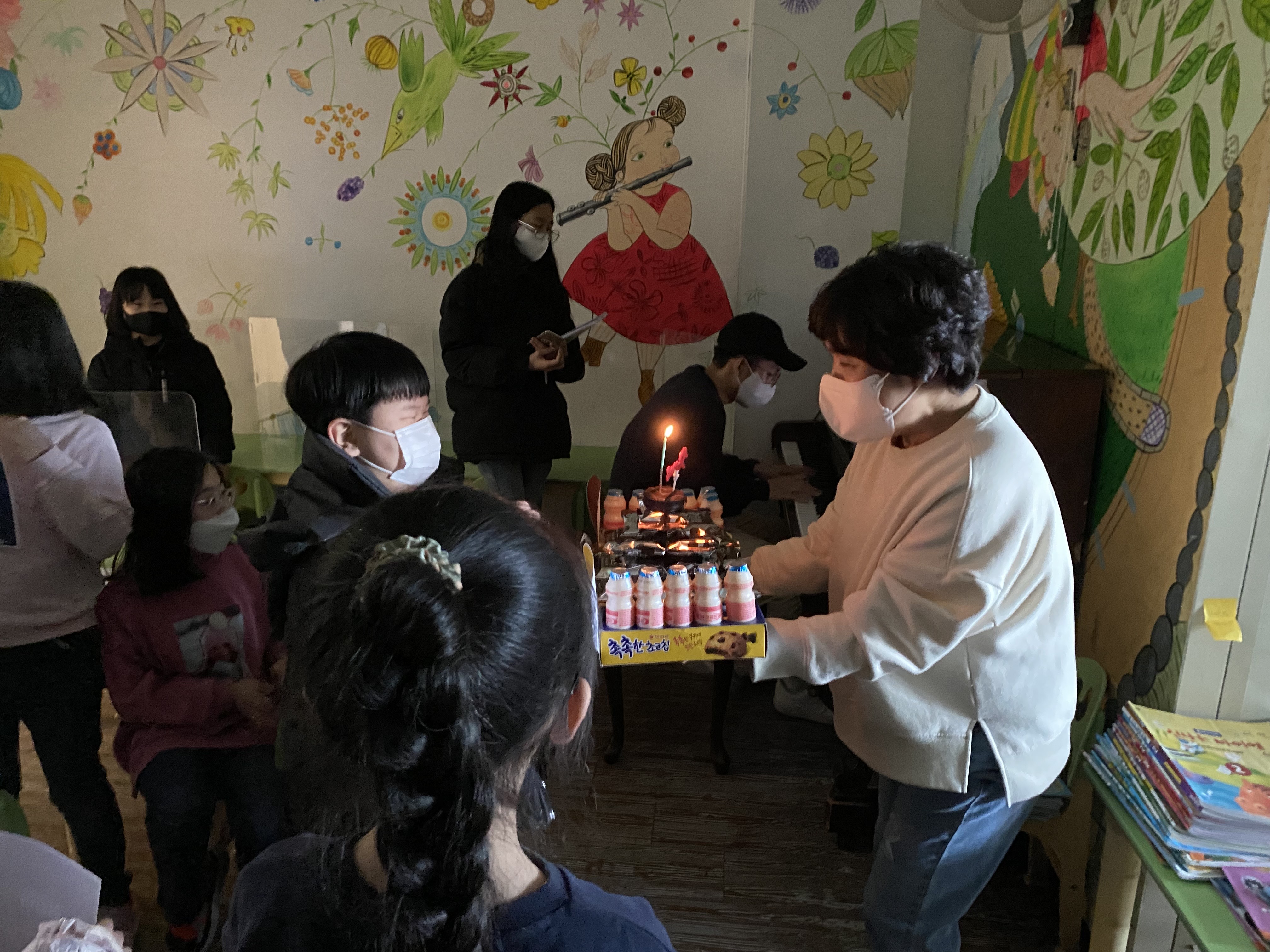 아이들이 들고 가기엔 크기도 크고, 요구르트도 고정되어 있지 않아 불안해 음악교실 선생님에게 케이크 들어 달라고 부탁드렸습니다.