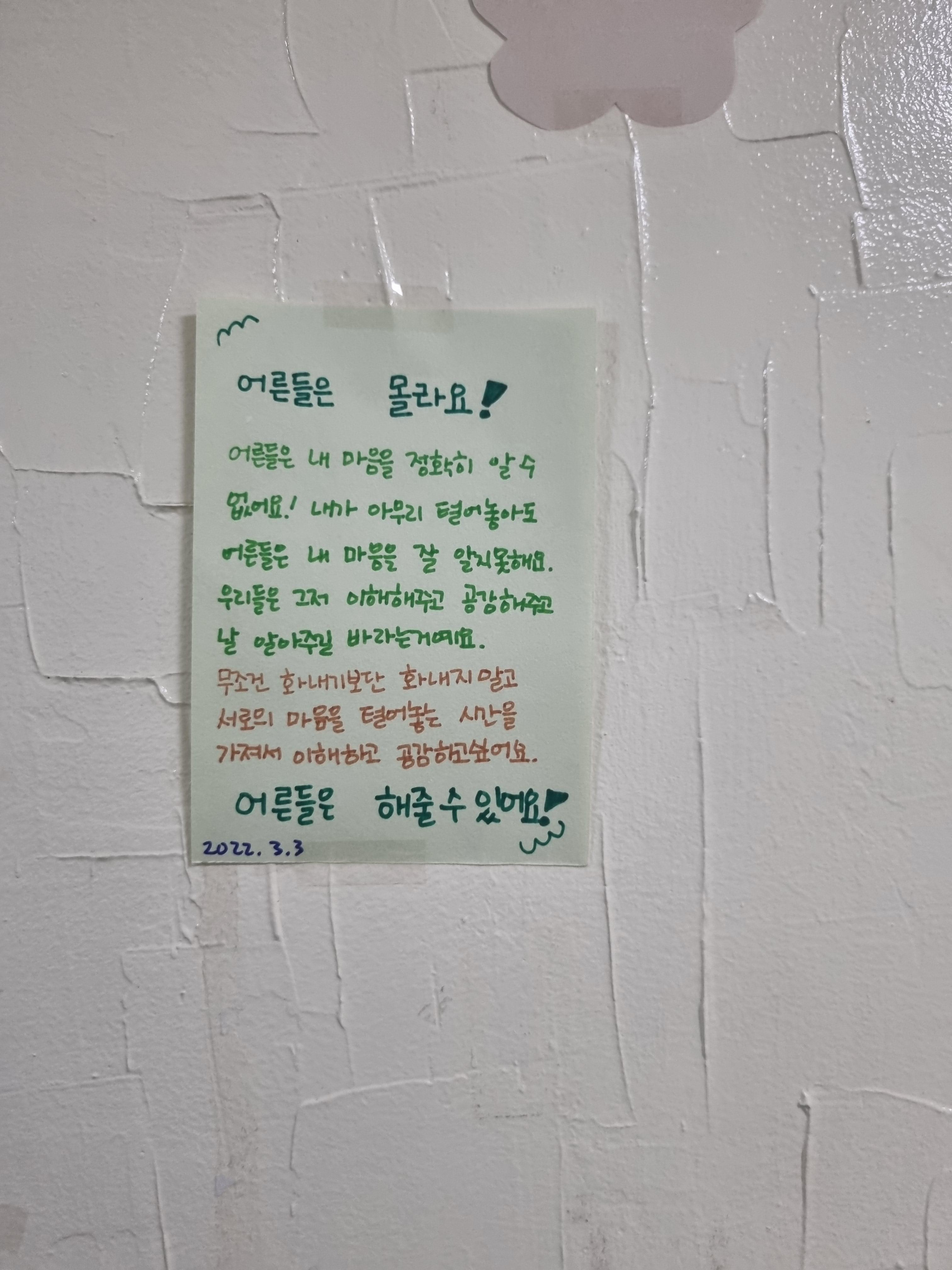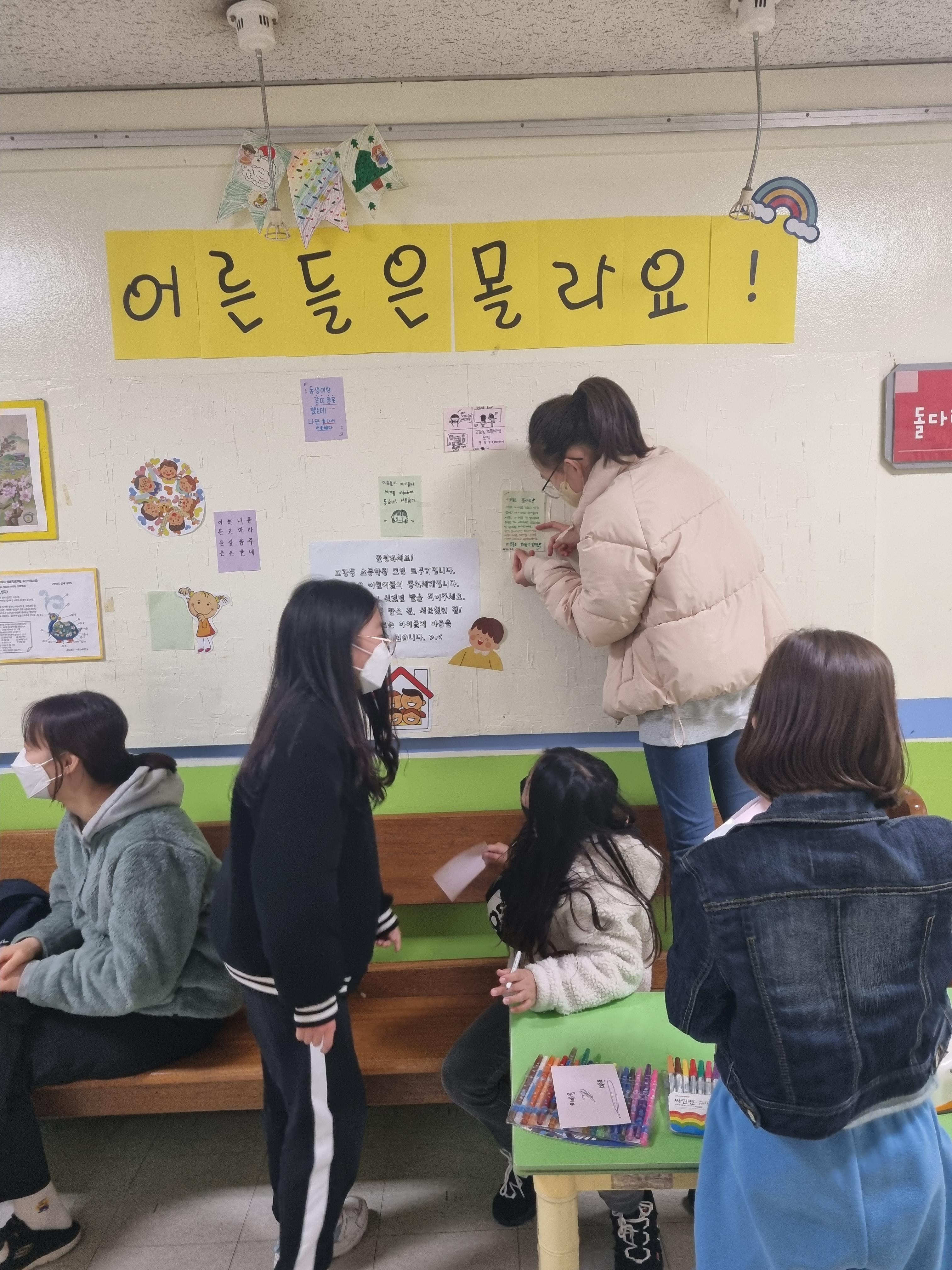 '다른 친구들도 자유롭게 이야기할 수 있고, 왔다 갔다 하시는 분들도 보고 아실 수 있게 같이 이야기해보자!'라는 결론이 나왔습니다. 그렇게 해서 만들어지게 된 '어른들은 몰라요.'