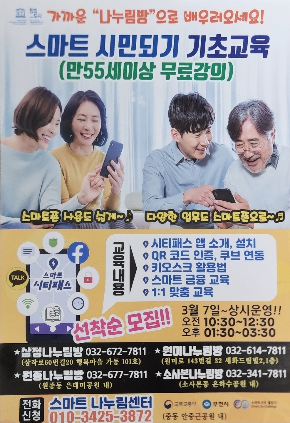 시에서도 조금 더 많은 지원을 해주어 '스마트 도시'를 위해 어르신들 뿐만 아니라 원하는 사람들이 원하는 스마트폰 교육을 받을 수 있게 되면 좋겠습니다.