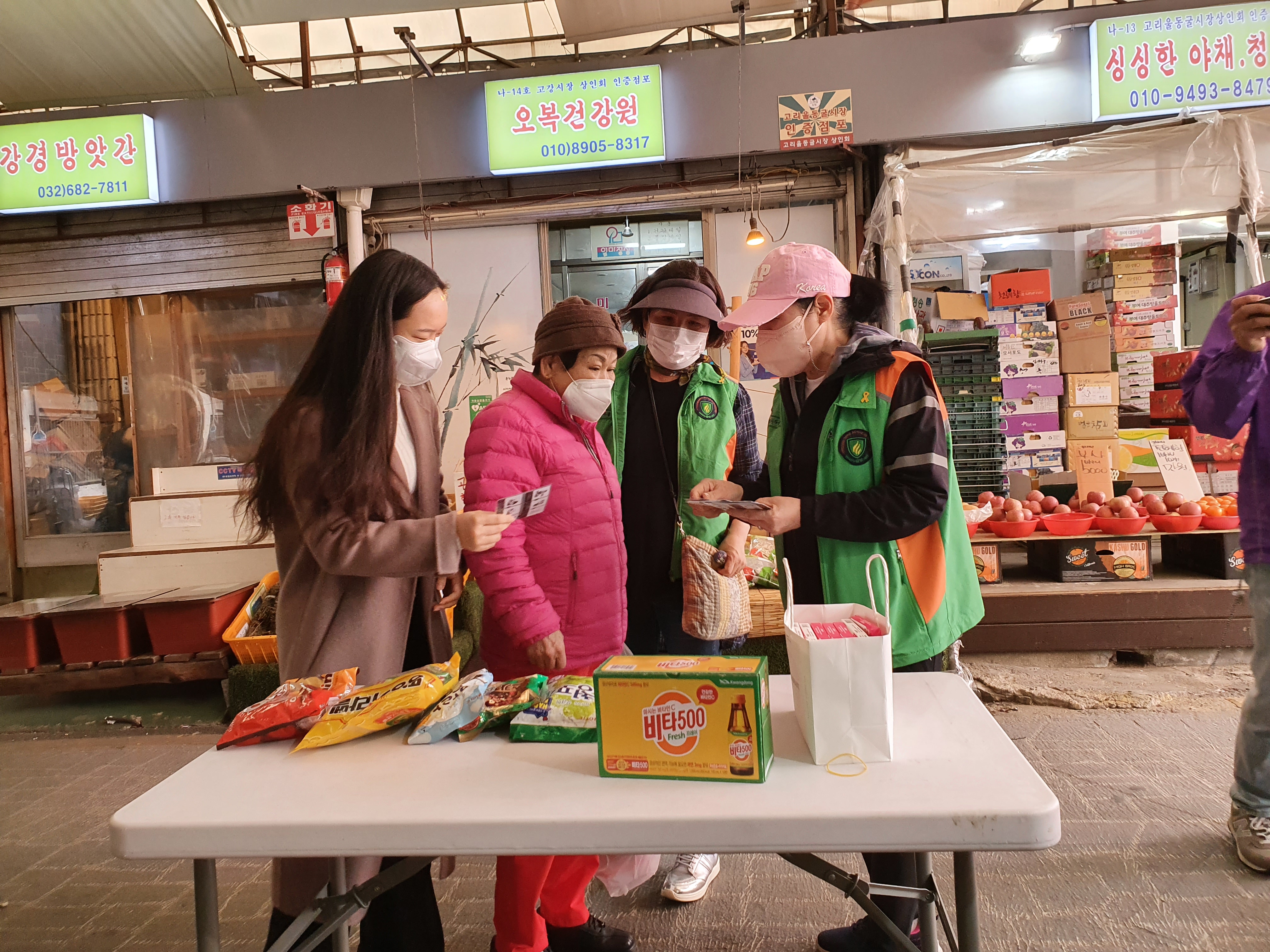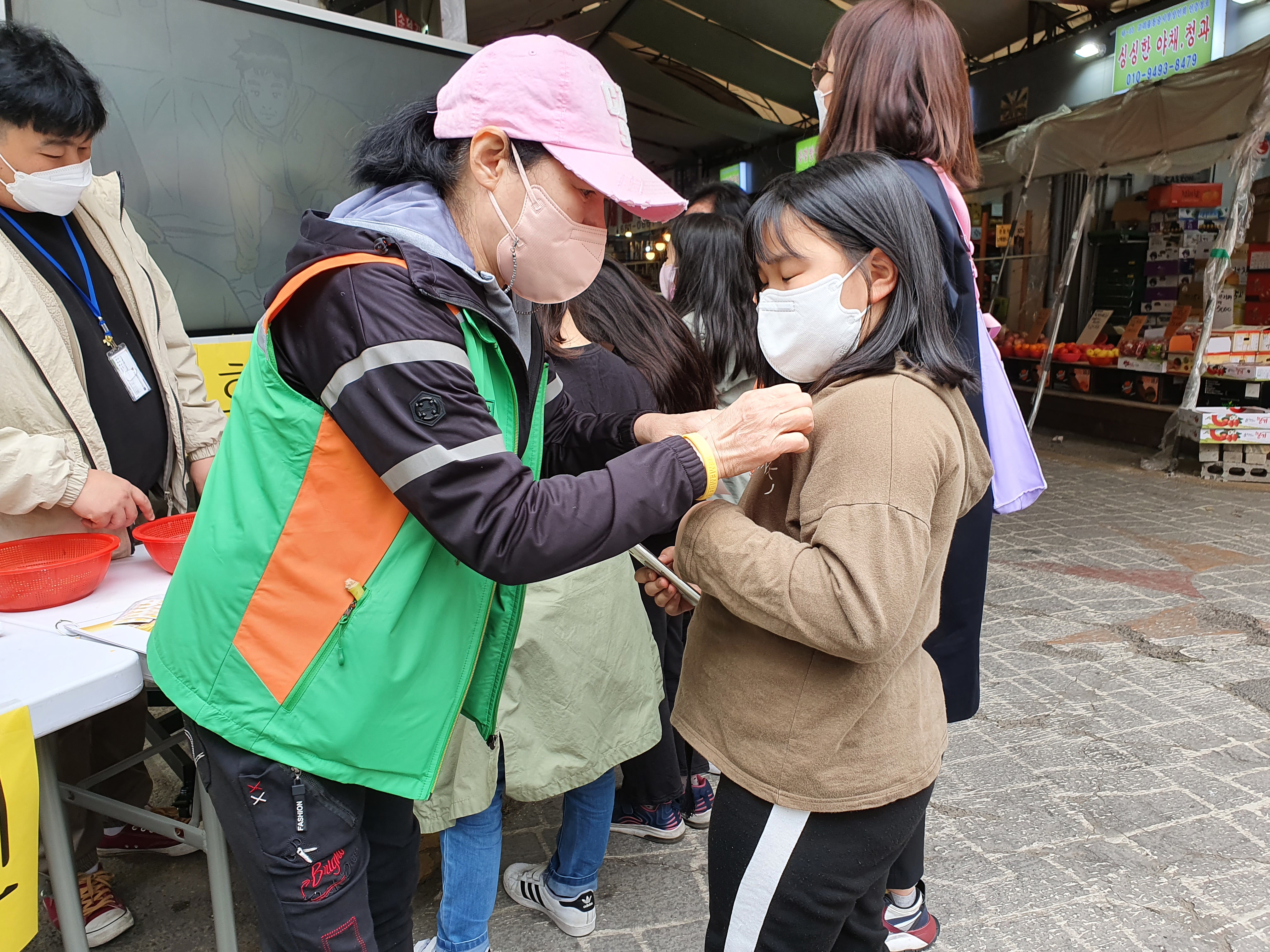 시장에 오가는 주민들, 상인들께 응급구조법 안내지를 나눠드리며