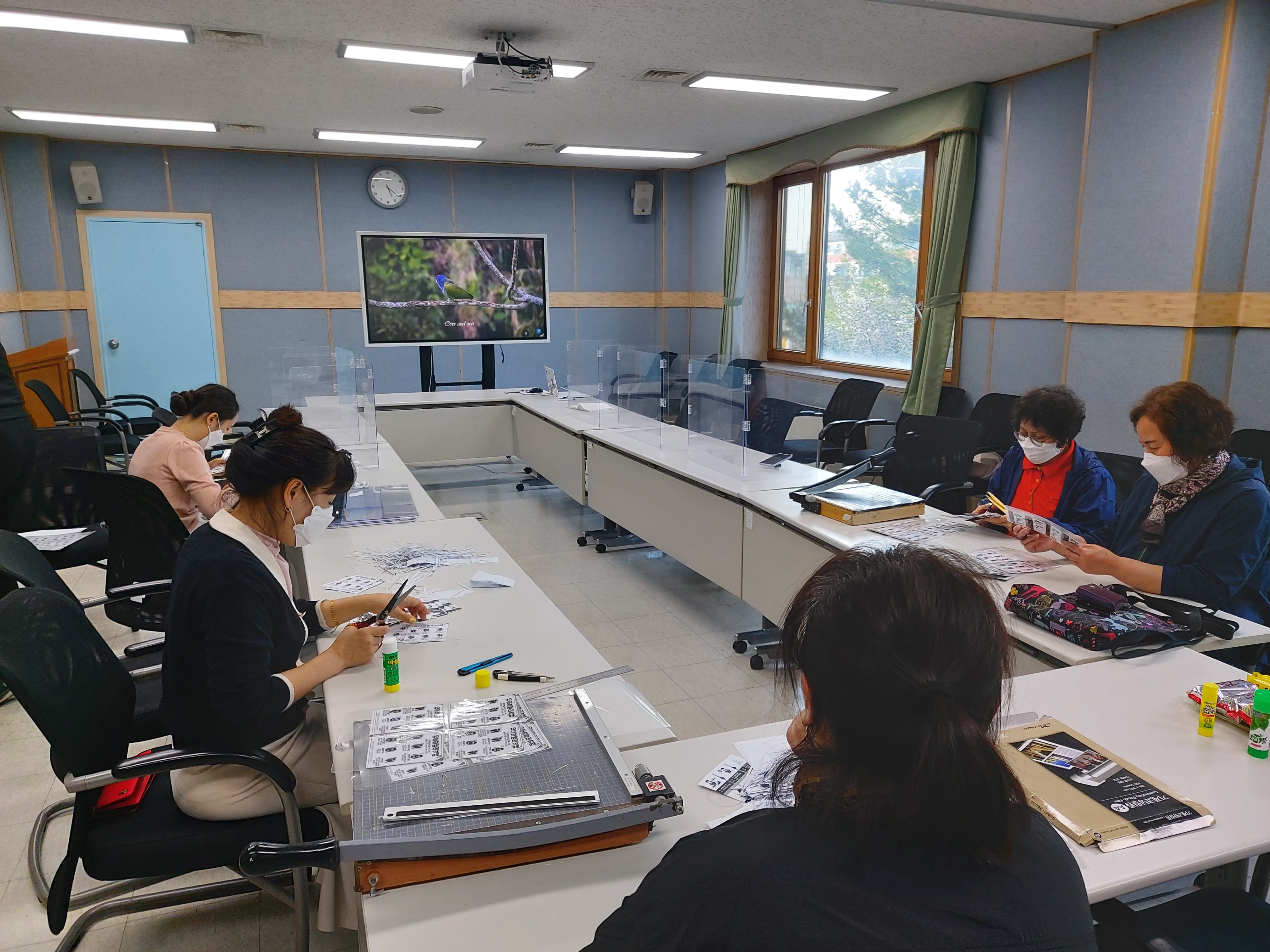 응급 구호 방법에 대한 그림을 붙이고 코팅을 하고