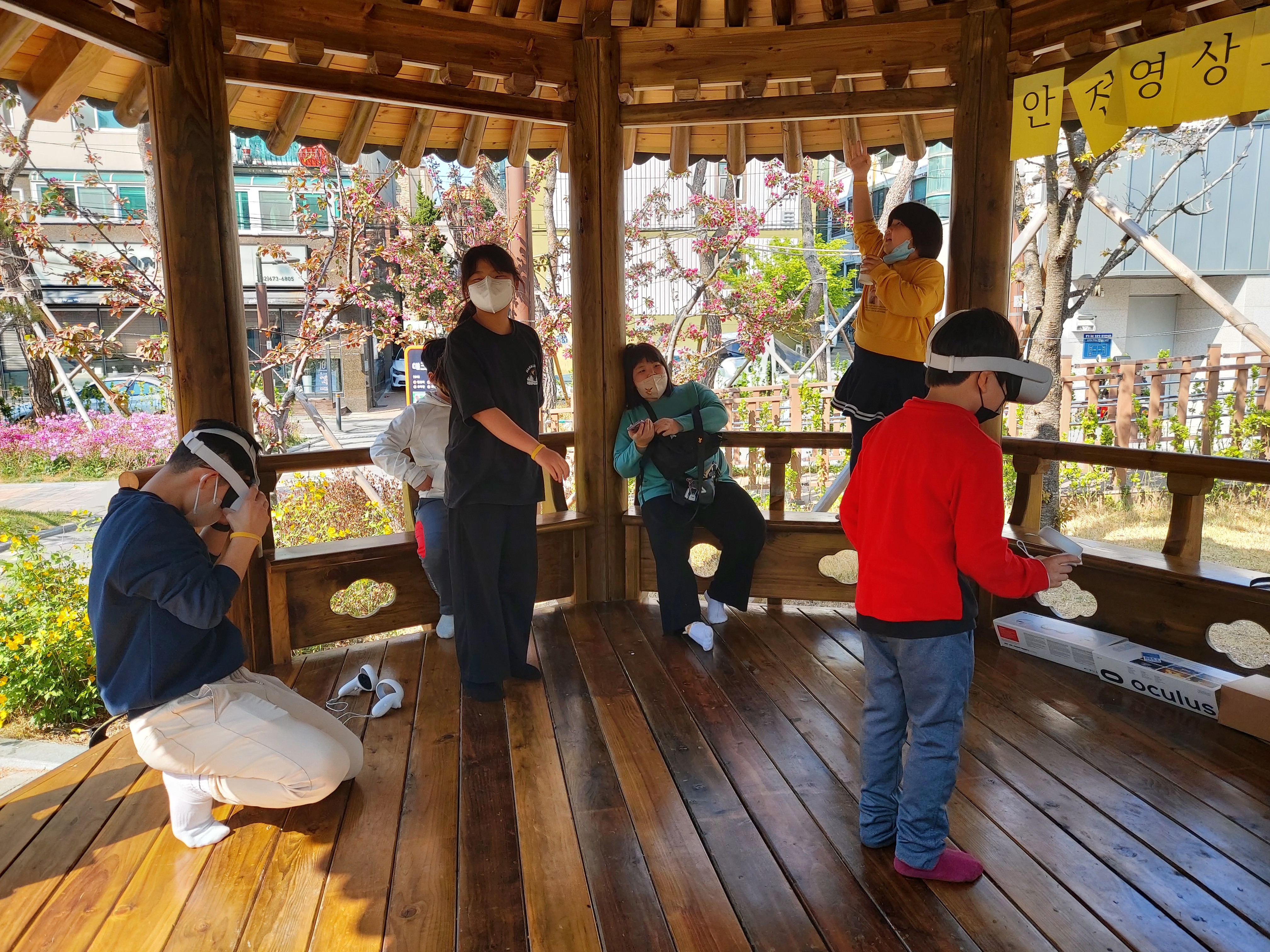 놀이터에서 놀고 있는 아이들이 관심 갖고 찾아주십니다.