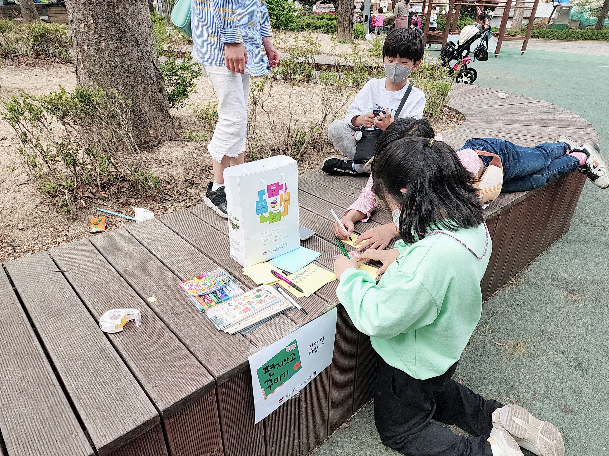오늘 까치울팀에서는 원종어린이공원에서 아동돌봄지원시스템구축 '우리 동네 우리 공원' 프로그램 일환으로 스티커 꾸미기를 진행했습니다.