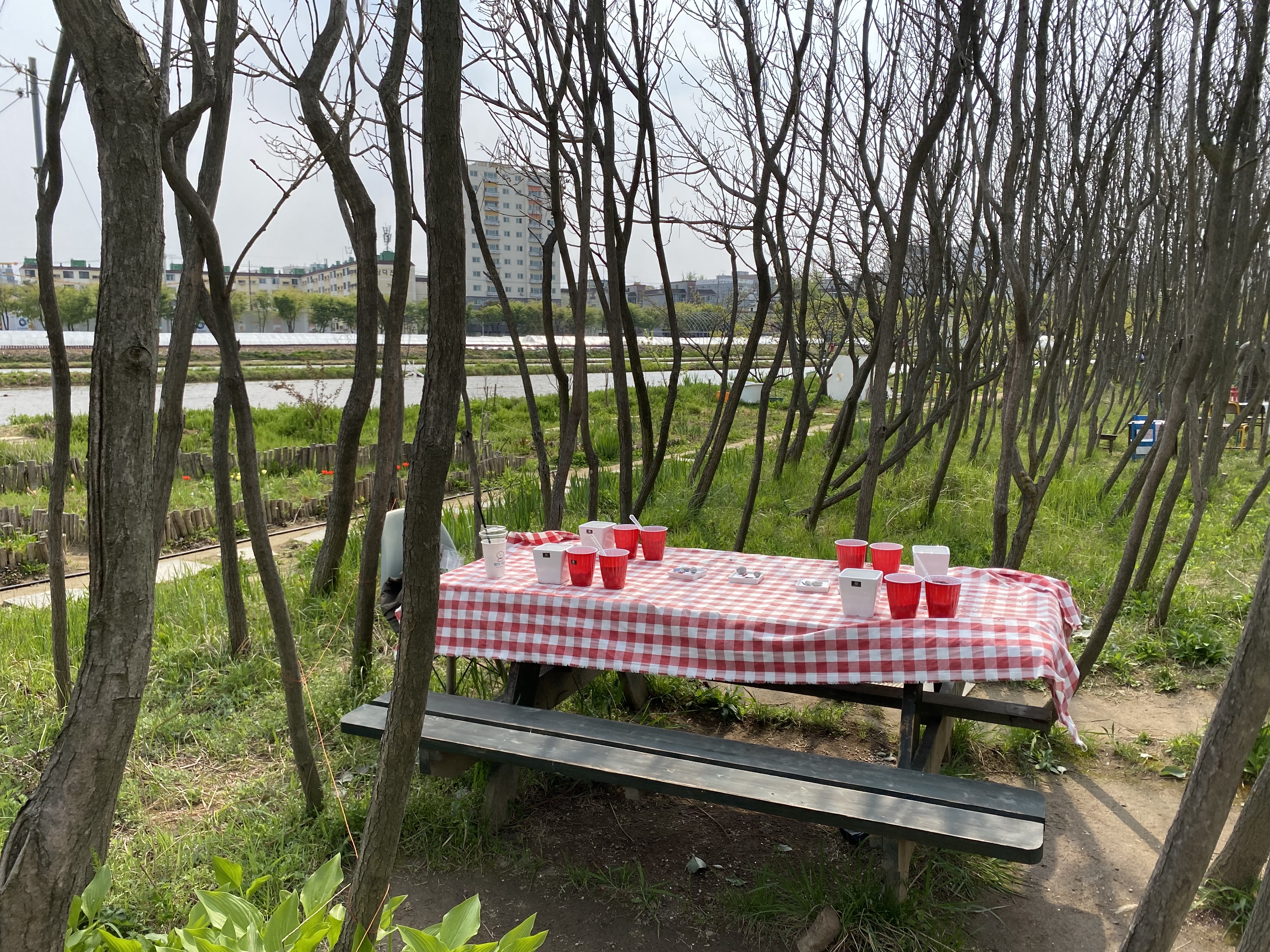 정원 앞 바로 논 풍경이 펼쳐지고 그 뒤로 아파트가 보입니다.