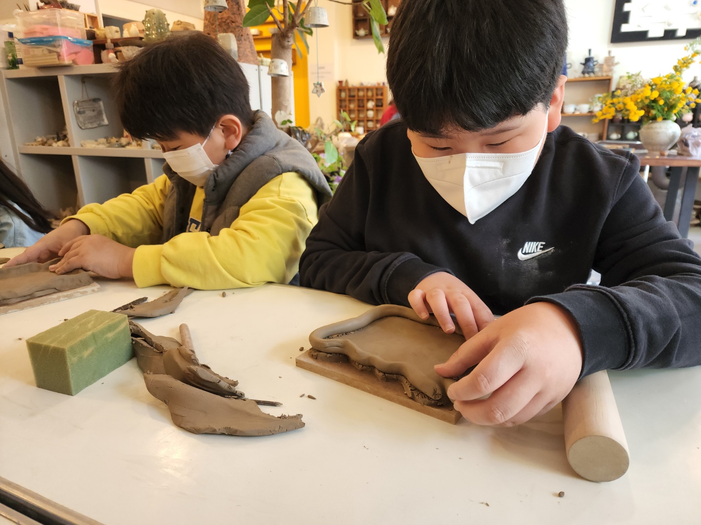 도자기를 이미 만들어본 친구들도 있고, 오늘 처음 만들어보는 친구도 있었습니다. 토끼 모양, 곰돌이 모양, 포켓몬스터에 나오는 메타몽 모양, 어떤 모양을 만들지 한참을 고민하던 아이들은 이내 다들 자신만의 개성적인 접시를 만듭니다.