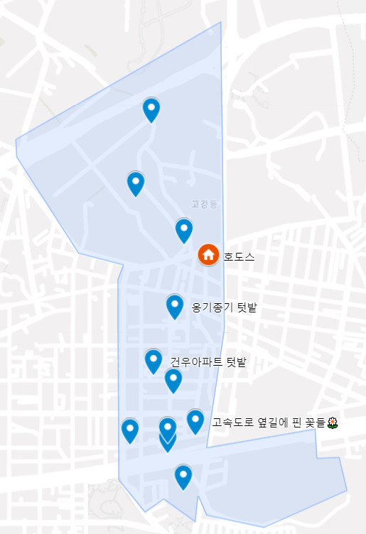 5월 21일까지 수주팀 사회복지사와 고강1동 사용 설명서 봉사자들은 시시때때로 고강1동의 텃밭과 꽃밭을 구글지도에 기록하려 합니다. 완성된 지도에는 더 많은 꽃밭과 텃밭이 기록되어 있기를 희망합니다.