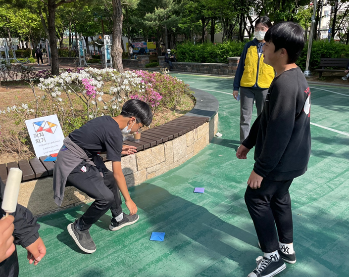 함께 준비한 친구들과 접은 딱지로 놀이에 참여하는 친구들과 딱지치기를 진행했습니다.