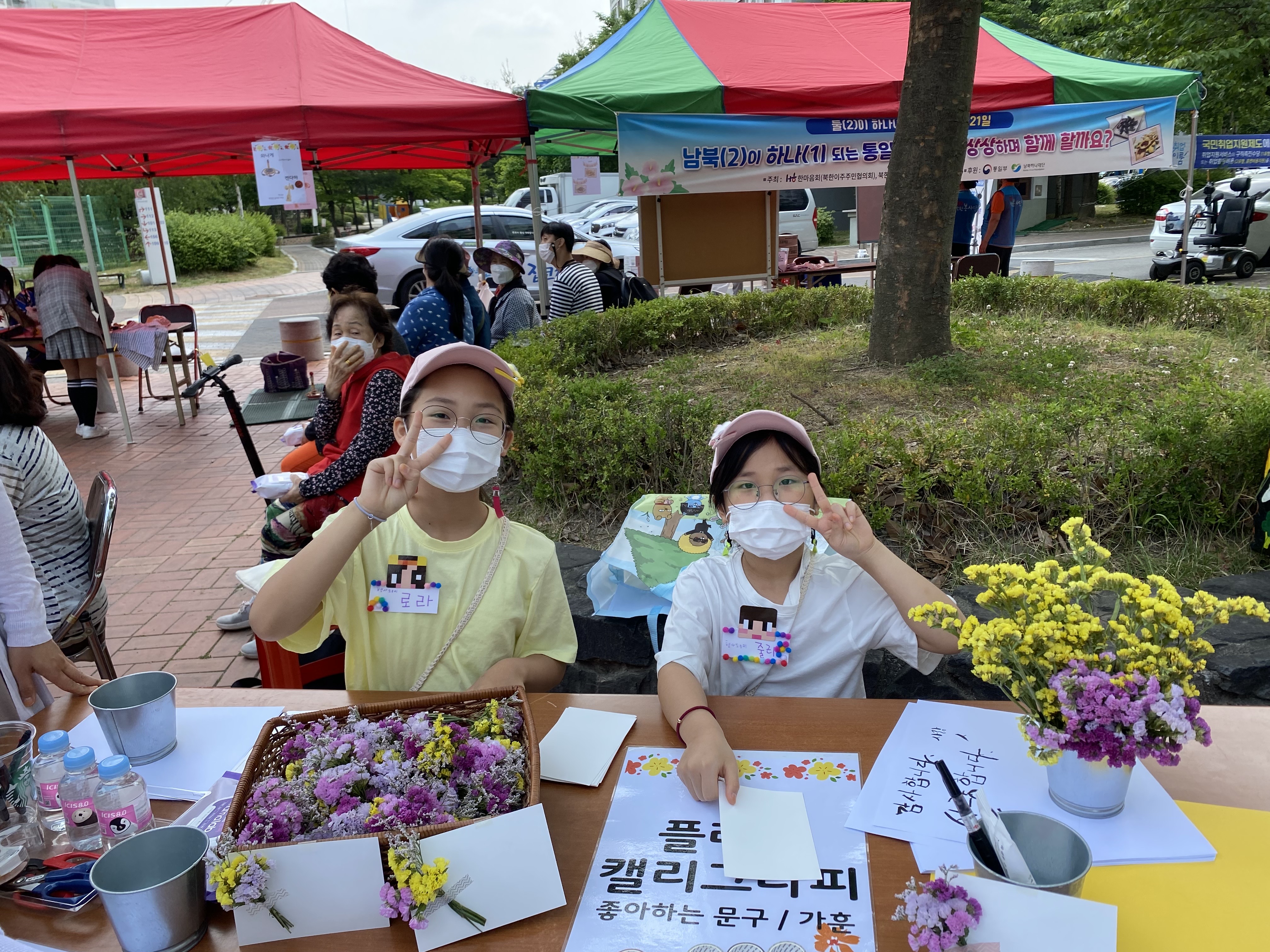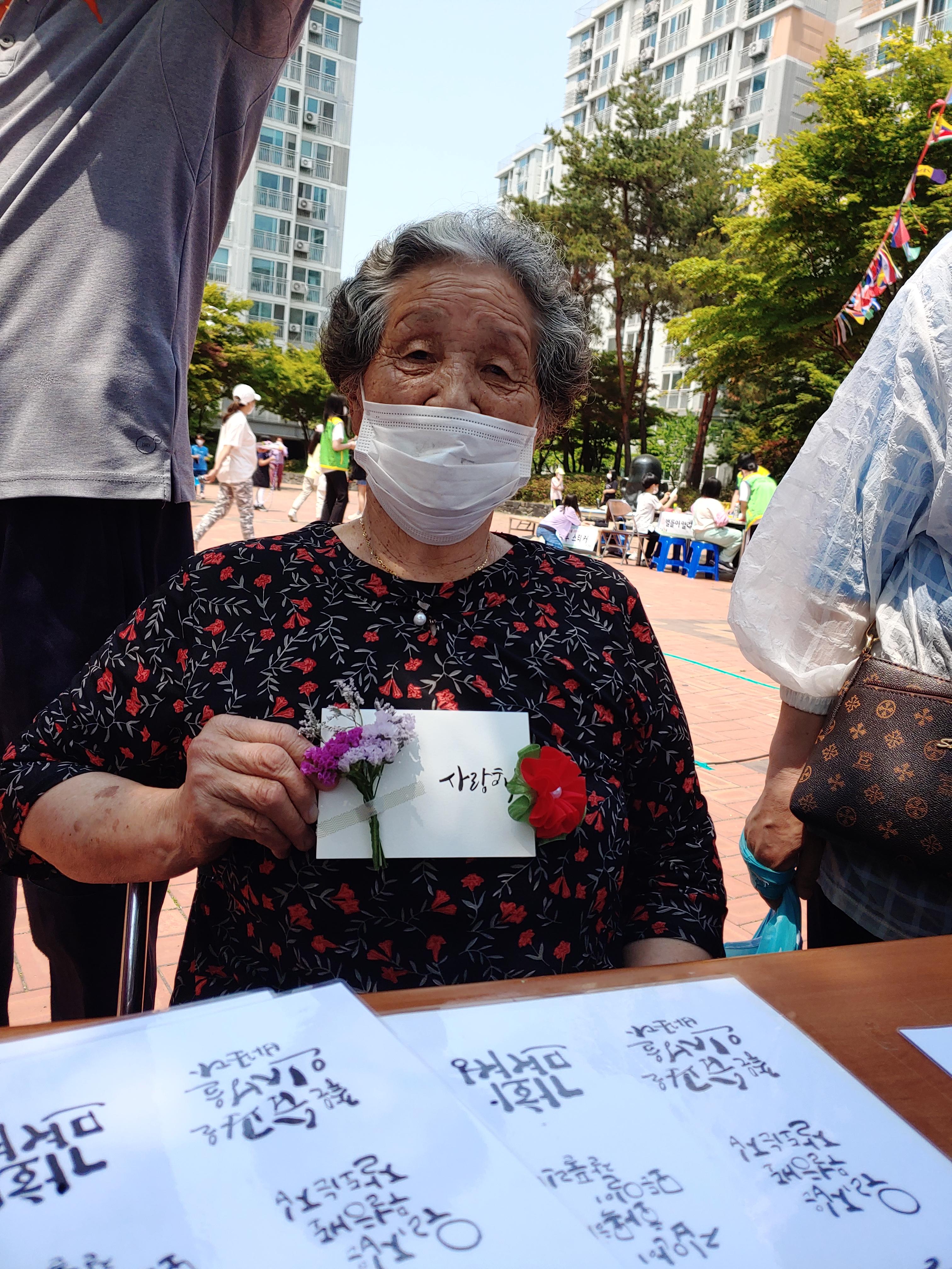 행사 당일 체험테이블 세팅을 하고 있는데 4학년 예쁜 친구 두 명이 다가왔어요. "뭐 하는 거예요? 저는 작년 행사에 왔었는데 이번에는 제 친구를 데리고 왔어요." 친구들은 30분을 기다려 참여한 첫 번째 부스 손님이셨어요. 한 글자 한 글자 신중하게 캘리를 써 내려가는 모습이 참 예뻤어요. 저희 아이들과 또래여서 원래 알고 지낸 친구처럼 대화하며 체험 방법도 알려주고 참여하는 아이들의 모습이 참 사랑스러웠어요. 많은 주민분들이 숨겨 두었던 글씨 솜씨를 뽐내시기도 하고, 결혼기념일이니 특별히 선생님이 써달라고 요청하셔서 정성껏 써 드리기도 했어요. 행사 당일은 둘이 하나가 된다는 5월 21일 '부부의 날'이었는데, 남편분께 선물하고 싶으시다며 체험하시는 모습이 참 감동이었어요. 주민분들 저마다의 소망을 담아 쓰신 글귀들이 댁에서 보실 때마다 힘이 되셨으면 좋겠다는 생각을 했어요.