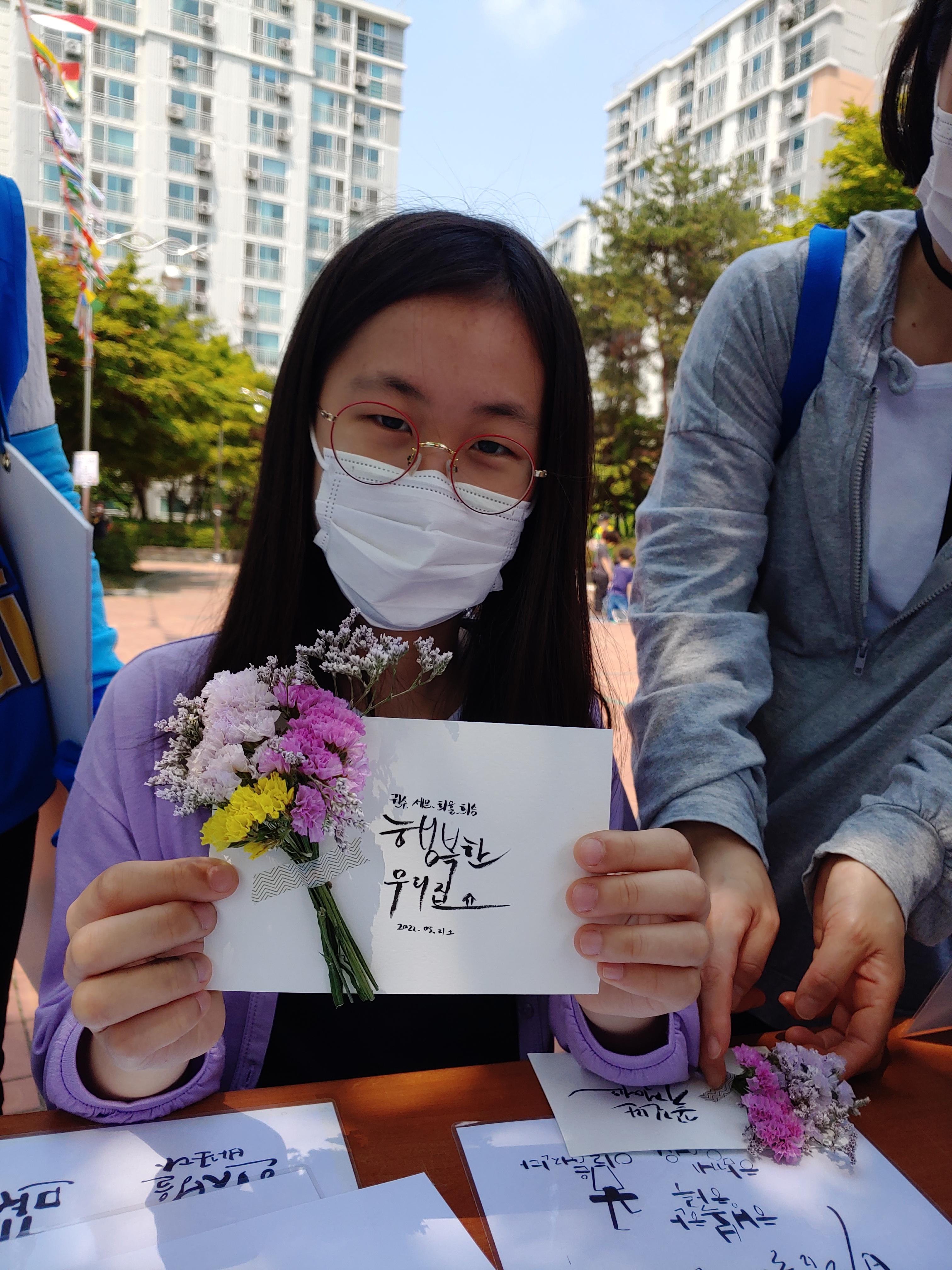 예지 - 배우는 걸 주로 많이 했는데 오랜만에 다른 사람을 가르쳐주는 걸 하니 좋았어요. 연습 종이와 엽서, 붓과 꽃 등이 필요하실 때 제가 드렸어요. 체험하신 분들께서 직접 만들어보신 엽서를 보고 좋아하실 때 가장 보람을 느꼈어요.