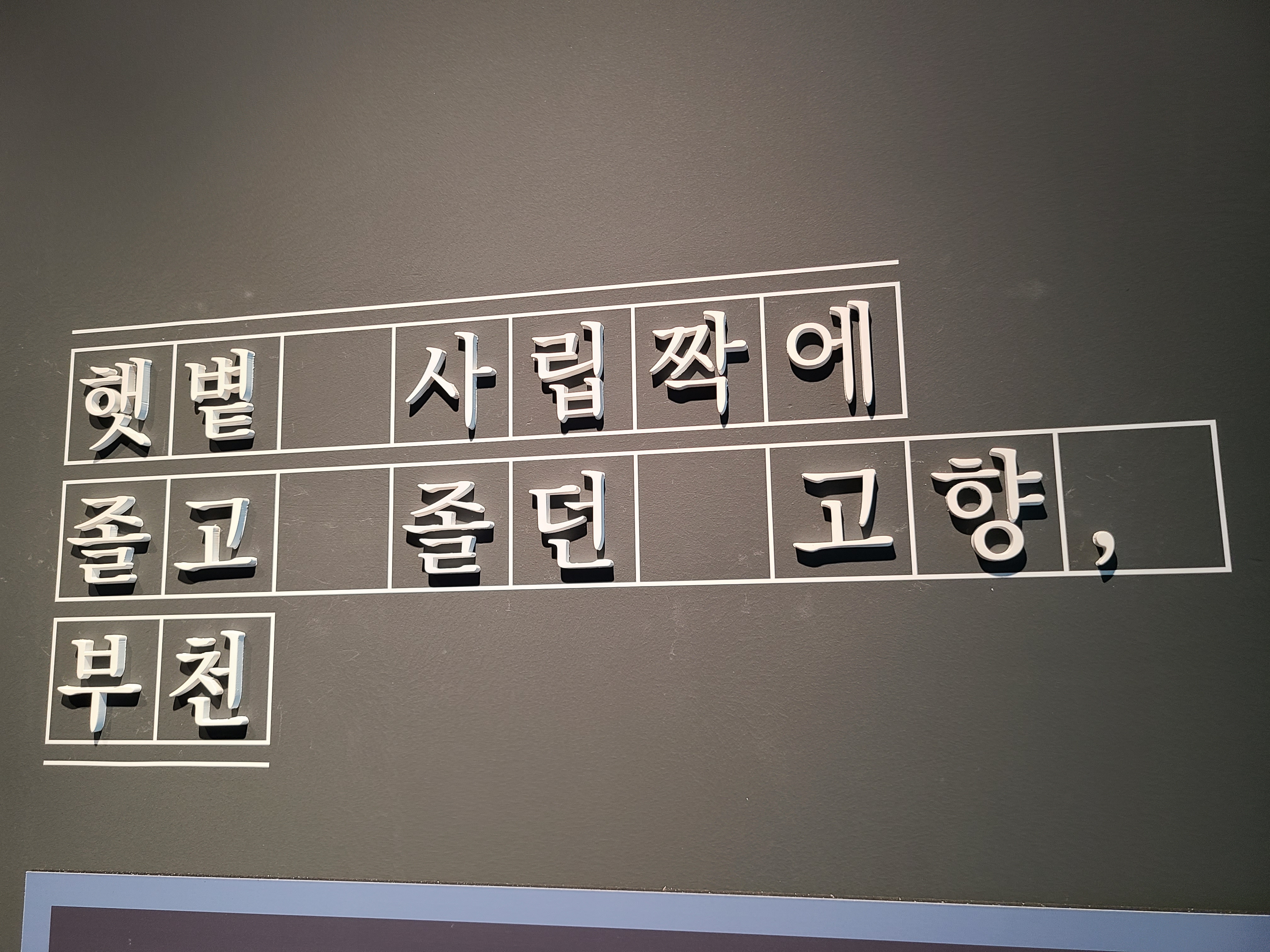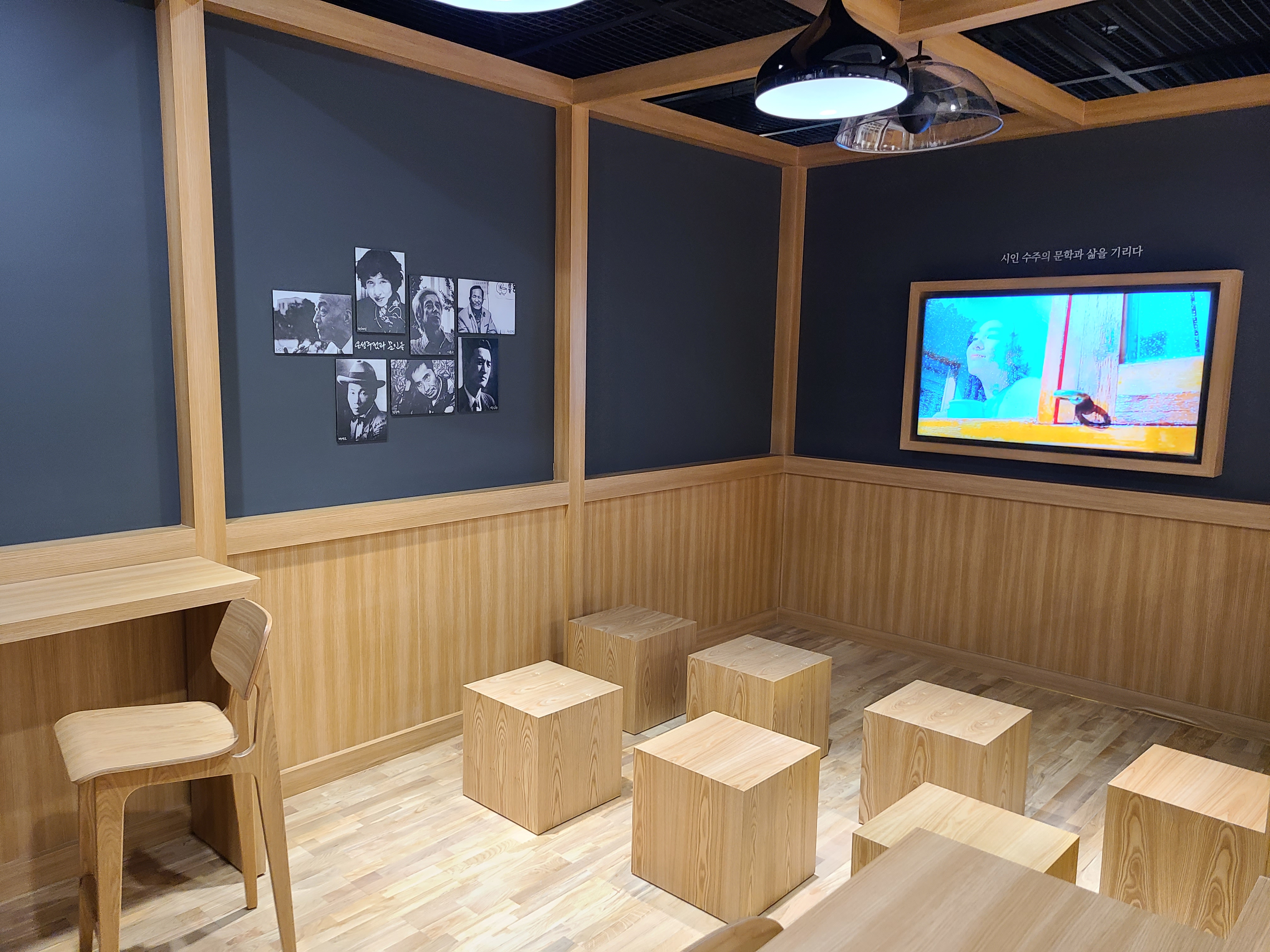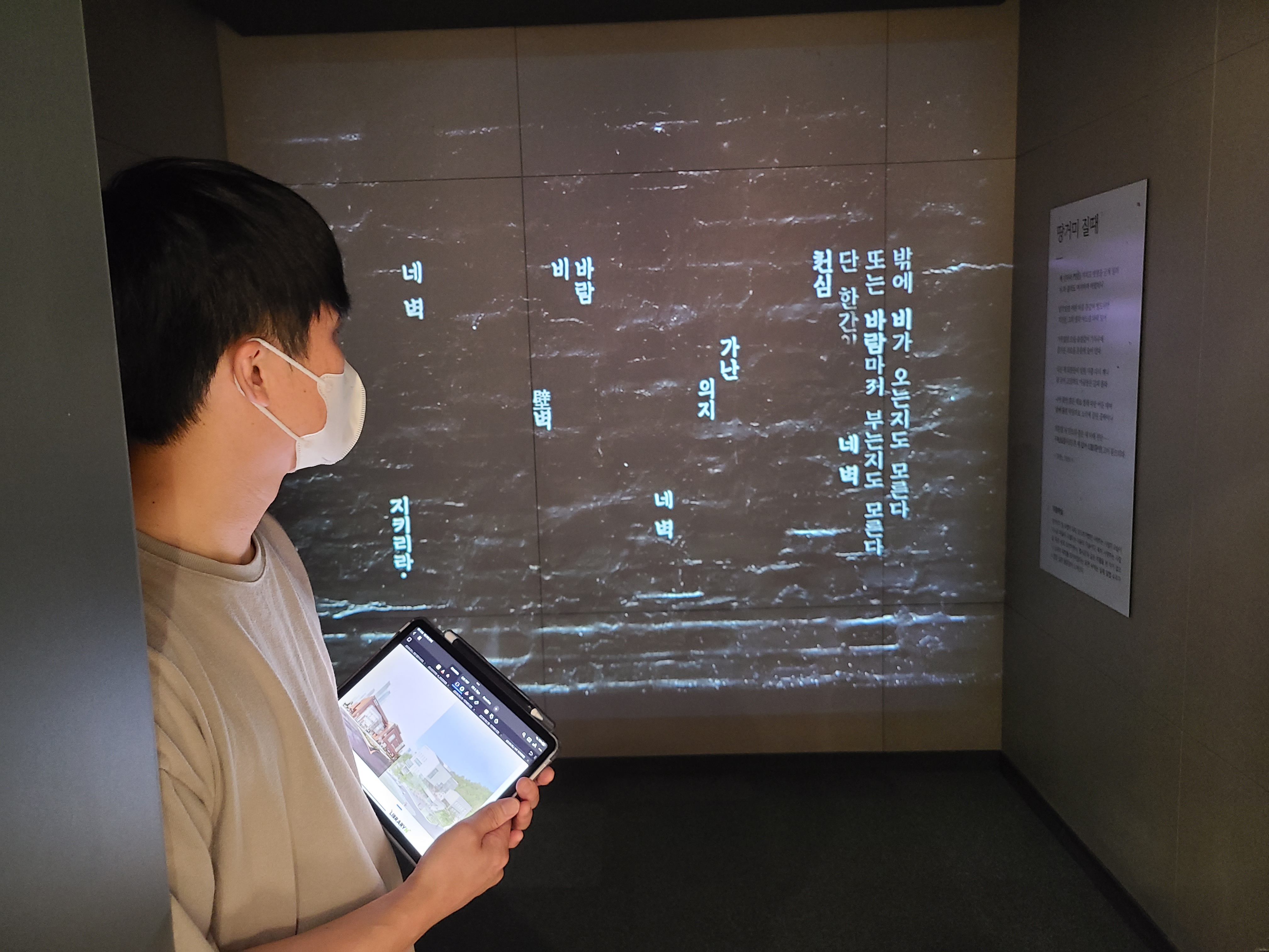 영상매체를 활용하였고, 자석을 활용하여 누구나 한 줄 시를 지어 볼 수 있는 공간도 있습니다.