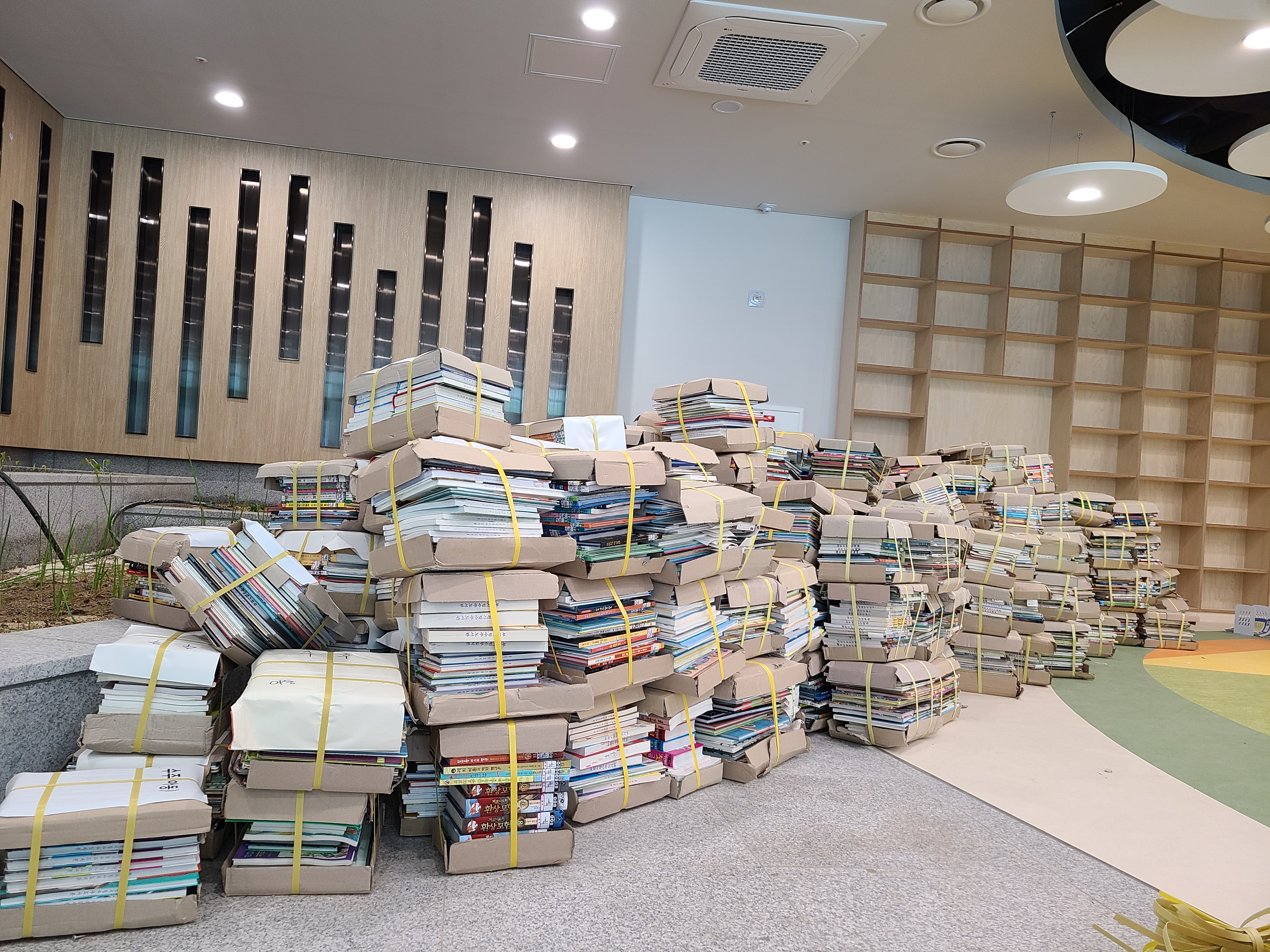 들어서자마자 탁 트인 계단식의 공간과 유아자료실, 어린이자료실이 있었고, 한 켠에는 집에 들어갈 준비를 하는 책들이 쌓여있었습니다