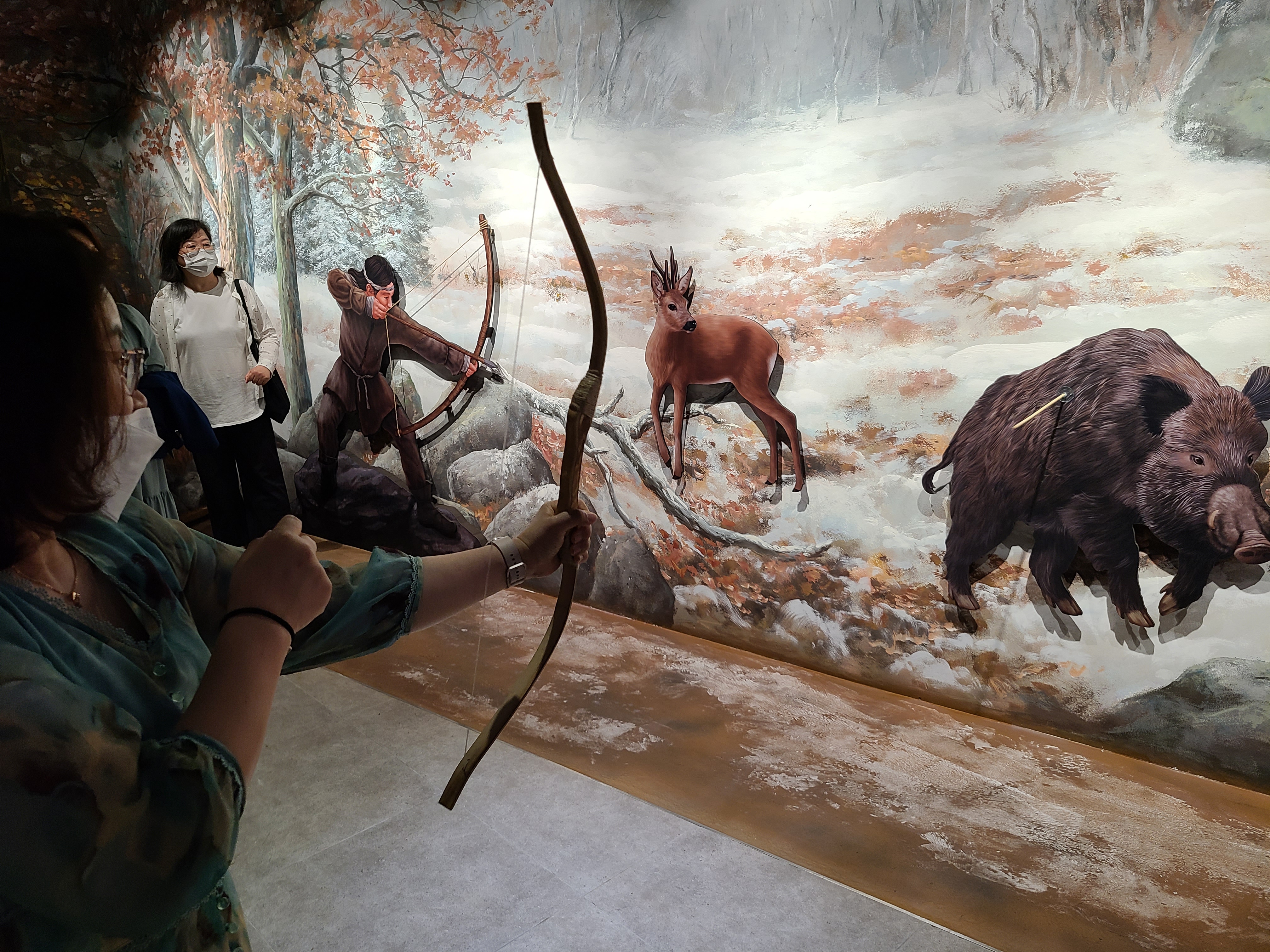 아이들이 직접 유적도 발굴해보고, 화살로 멧돼지와 고라니도 잡아보고(화살로 멧돼지와 고라니를 맞추면 꾸웨엑~하고 우는 소리가 나요!!!) 청동기시대의 움집에서 음식과 의복(동물의 가죽)을 보관하는 방법도 알 수 있게 움집도 있습니다.