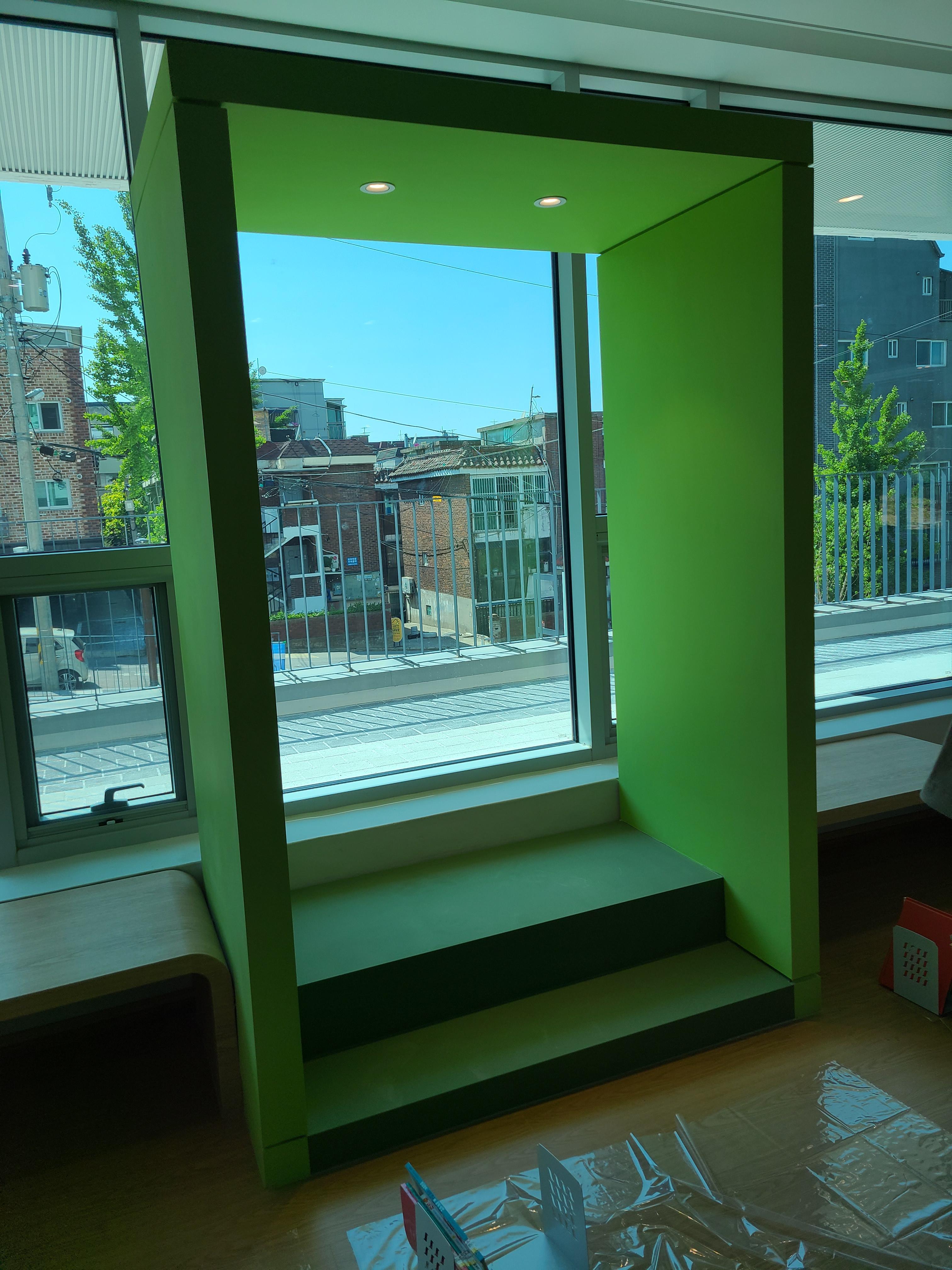 자연이 들어오는 느낌으로 창 밖에는 푸른 나무가 보이고 구석구석에는 숨기 좋아하는 아이들을 위한 공간이 여러 군데 있습니다.
