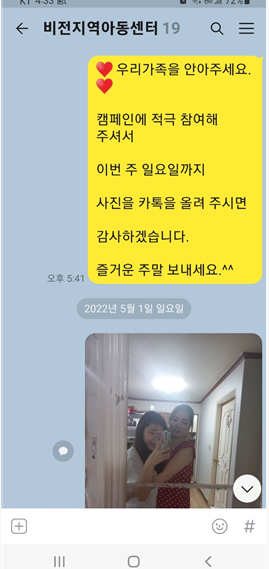 원장선생님은 ‘아이에게는 사람이 안아주는 온기가 중요한데, 이번 캠페인 활동을 통해 가족들간의 사이가 더 돈독해지고 애정이 더 깊어진거 같아요’ 라고 합니다.
