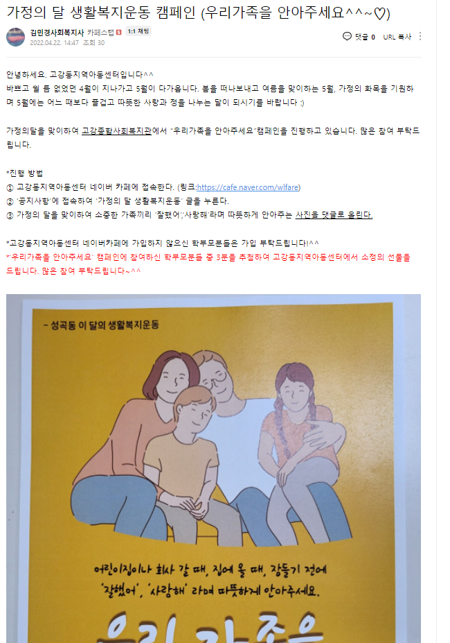 | [생활복지운동] 가정의달 맞이 생활복지운동 '안아주세요' 마을과 함께하기 (0) | 2022.05.23 |