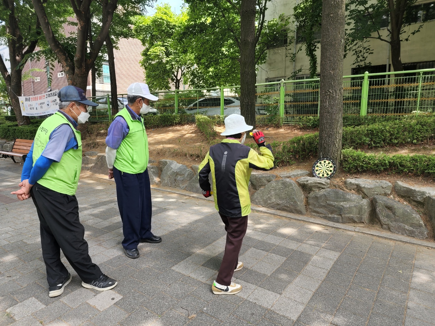 오정노인복지관 어르신 일자리로 공원 관리 업무를 맡으신 어르신들께서 다트를 즐기십니다.