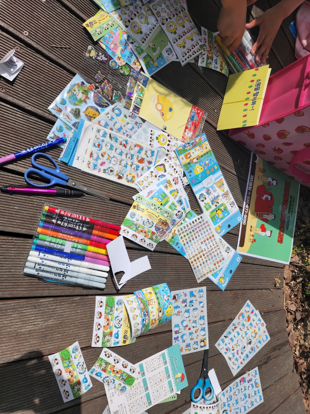 아이들은 학원 시간에 쫓기면서도 스티커 꾸미기의 매력에서 헤어나오지 못합니다.