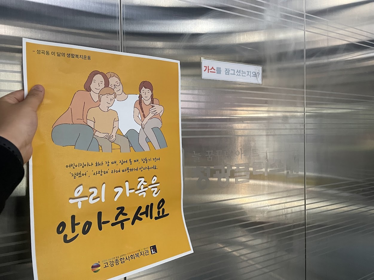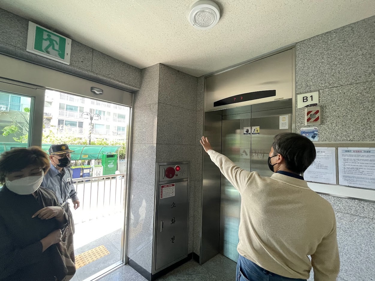 소장님께서는 “좋은 일 하는건데 부착해도 괜찮을 것 같다”고 하십니다. 긍정적인 반응에 이번 생활복지운동을 시작으로 앞으로도 좋은 주제를 주민들에게 알리고, 홍보할 수 있게 도와주실 것을 부탁드렸습니다. 허락 받은 뒤 소장님, 통장님과 함께 홍보지 부착하기 좋은 곳을 둘러봅니다. 승강기 위치한 라인마다 구조가 달라 각각 다르게 붙여야 할 것 같습니다.