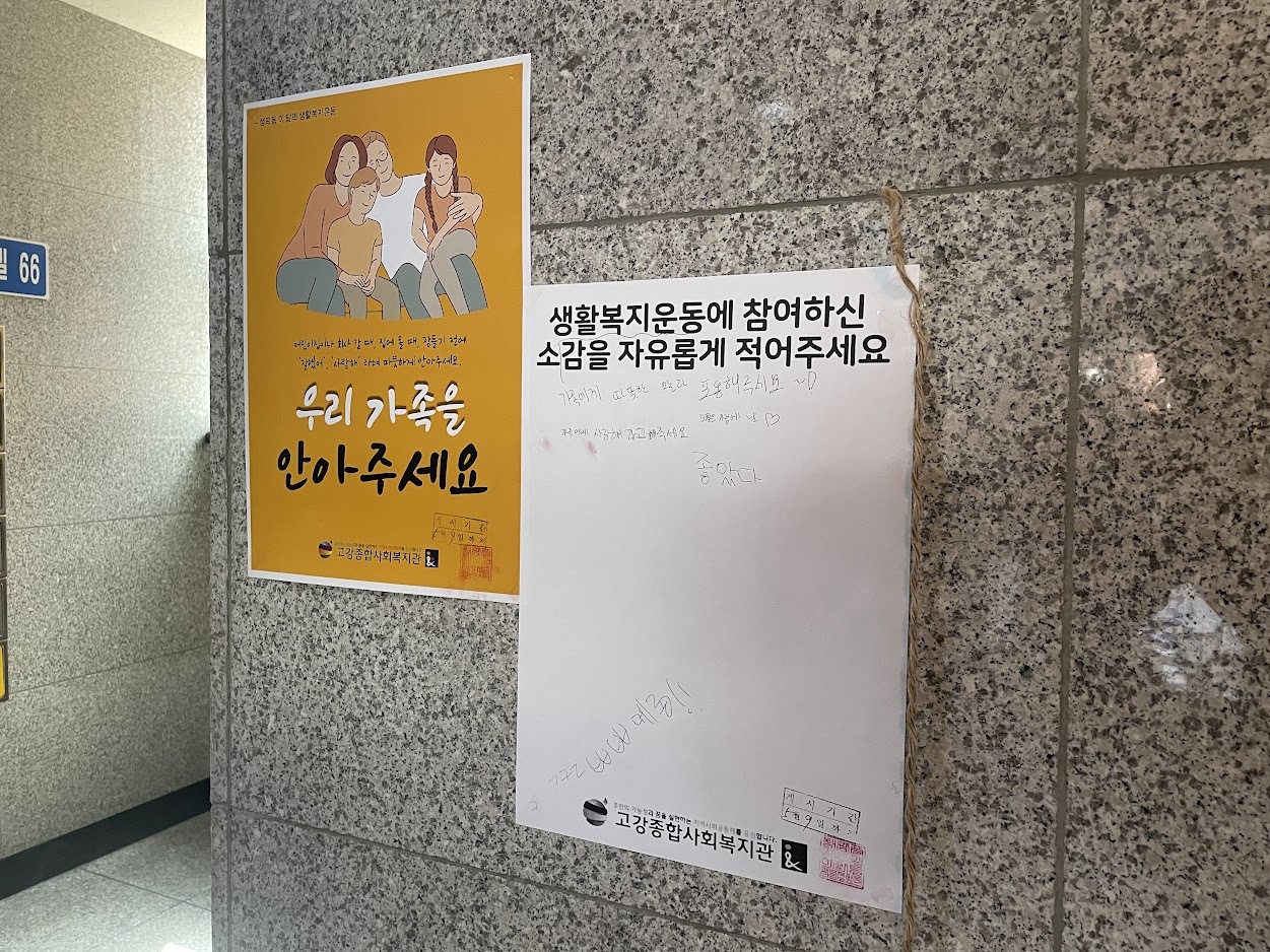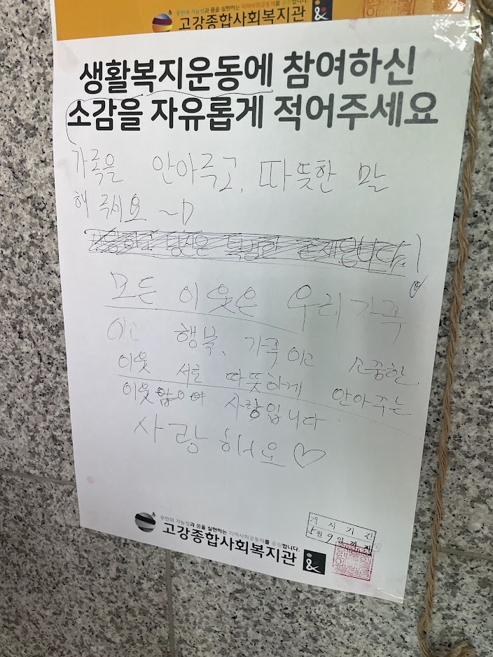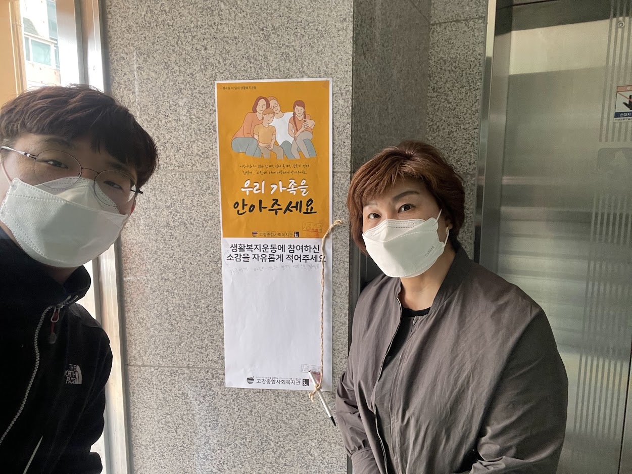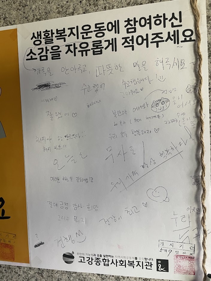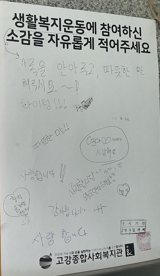소감을 적을 수 있게 준비한 홍보물을 부착하고 있을 때 통장님이 소감 받는 홍보지를 이해하지 못하는 주민이 있을 것 같다는 의견 주셨습니다. 홍보 포스터에 ‘생활복지운동’이 적혀 있어 큰 고민 없이 사용한 표현입니다.