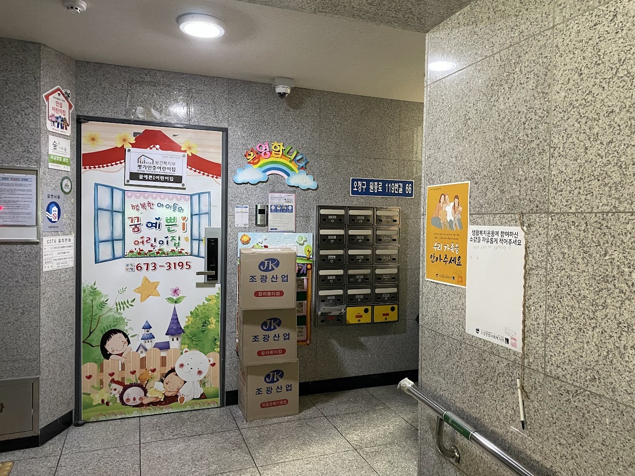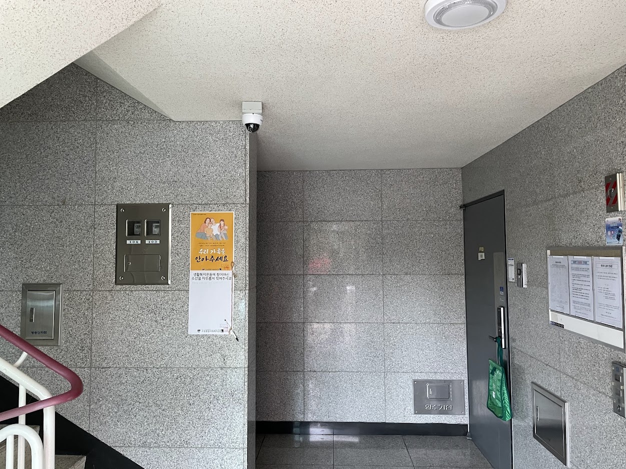 1층에 주민이 사는 곳도 있고, 그렇지 않은 곳도 있습니다. 또 경사로가 설치된 라인, 가정 유치원이 있는 곳도 있습니다. 다양합니다. 건물 구조가 모두 달라 동일하게 부착할 수 없었지만 최대한 눈에 잘 띄고, 소감 적기 불편하지 않은 위치에 부착했습니다.