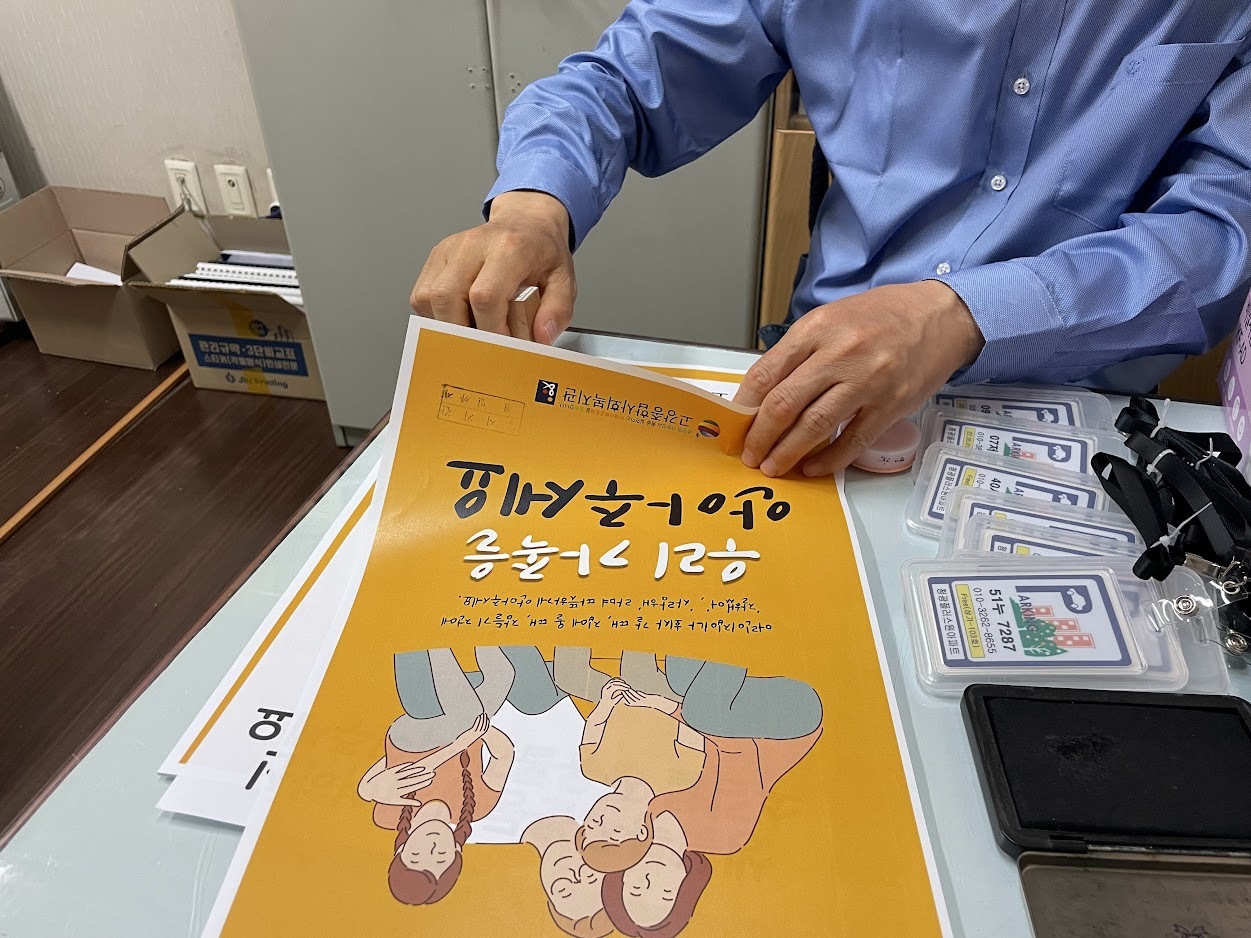 답사를 바탕으로 인쇄물을 준비해 아파트에 방문했습니다. 게시물 부착 허가를 받기 위해 관리소장님께 찾아갔습니다.