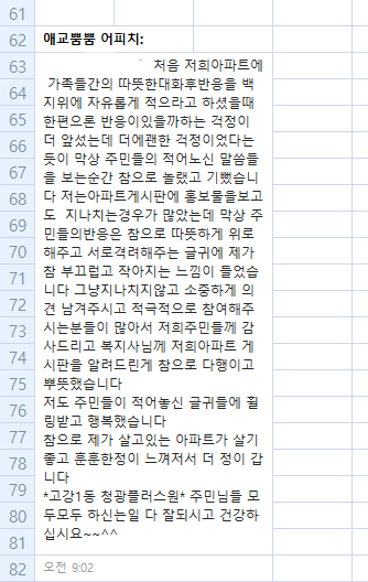 가족을 안아주고, 따뜻한 말 전해준 소감 외에도 이웃을 응원하는 글을 적어주신 분들이 많이 계시다고 말씀드렸습니다. 글을 찾아 읽으시고는 함께 사는 이웃의 좋은 점을 이야기 해 주십니다.