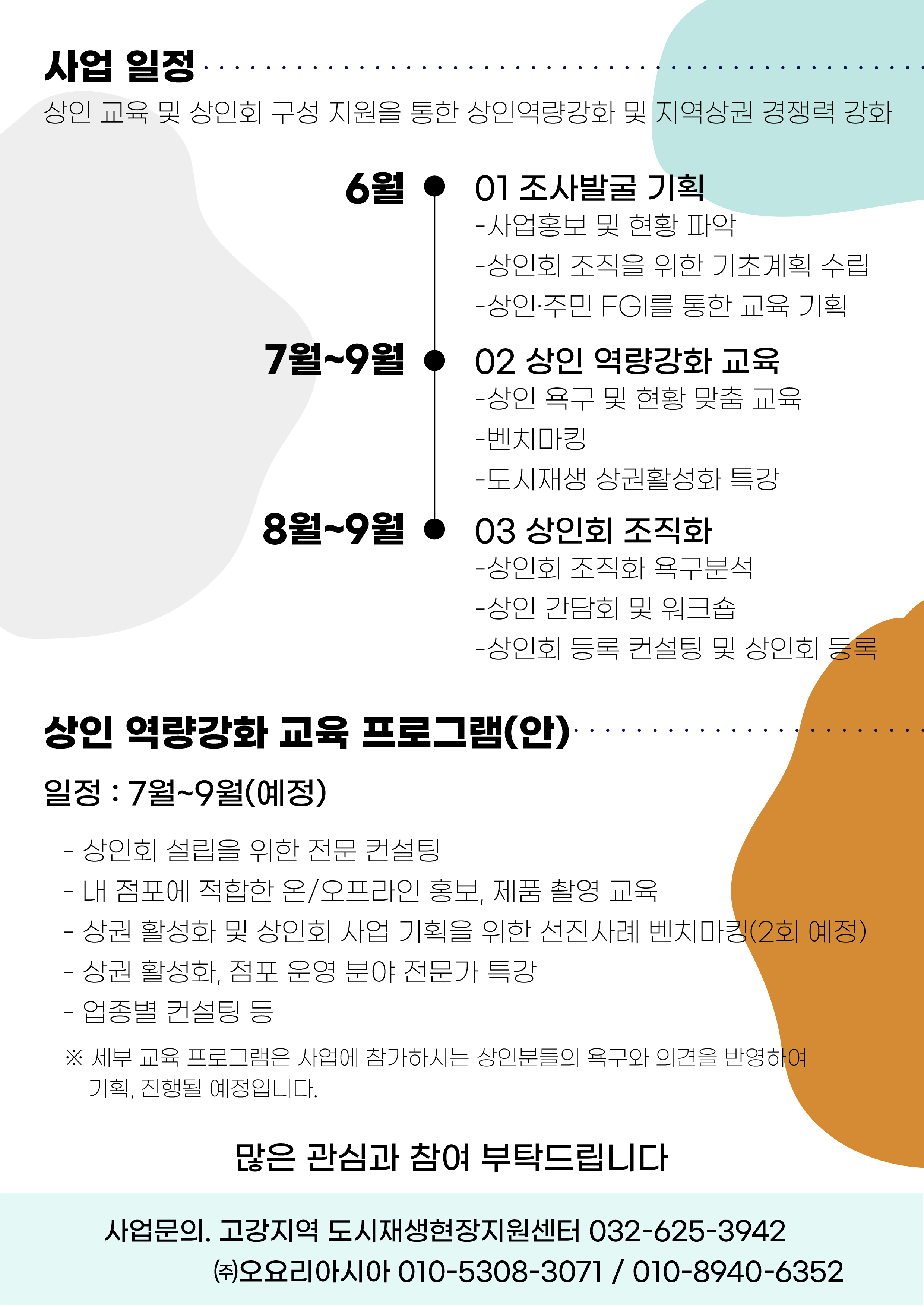 - 지역경제 활성화, 경쟁력 강화를 위해 시장/상점가 상인을 대상으로 교육을 하고 상인회 구성 지원을 하는 사업을 말합니다.