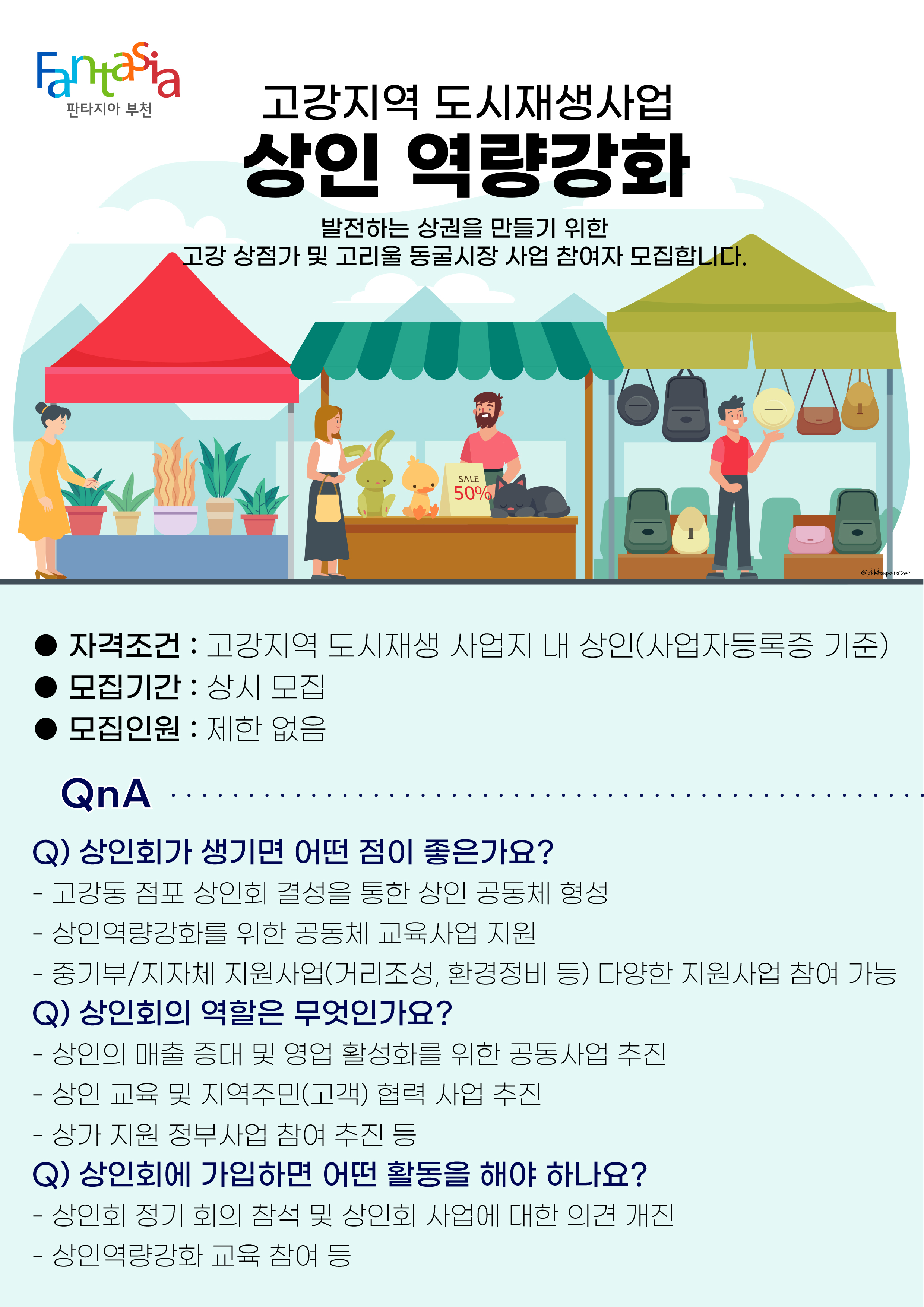 * 고강지역의 상권을 발전시키기 위해 고강 상점가(고강초 부근) 및 고리울 동굴시장 사업 참여자를 모집합니다.