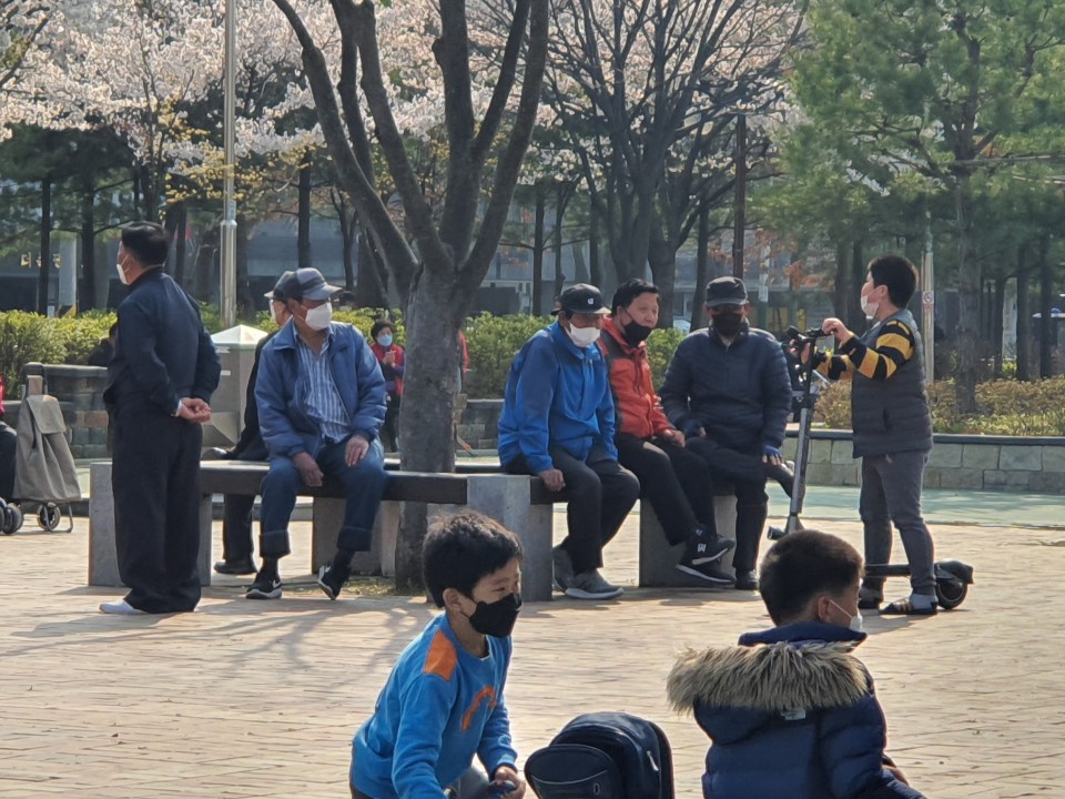 수주공원에는 장기를 두는 남자 어르신, 강아지와 함께 산책하는 주민, 놀이터에서 친구들과 노는 아이들, 그러한 아이들을 지켜보는 부모님, 의자에 앉아 쉬는 주민들로 붐볐습니다.