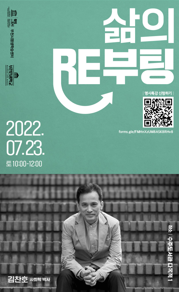 2022 부천인생학교 명사특강 "삶의 리부팅" 김찬호교수의 특강이 대면과 녹화송출로 진행됩니다. 긴 삶의 여정을 되돌아 보고 다시 힘을 얻어 도전과 기회를 꿈꿀 수 있는 시간을 마련하였습니다